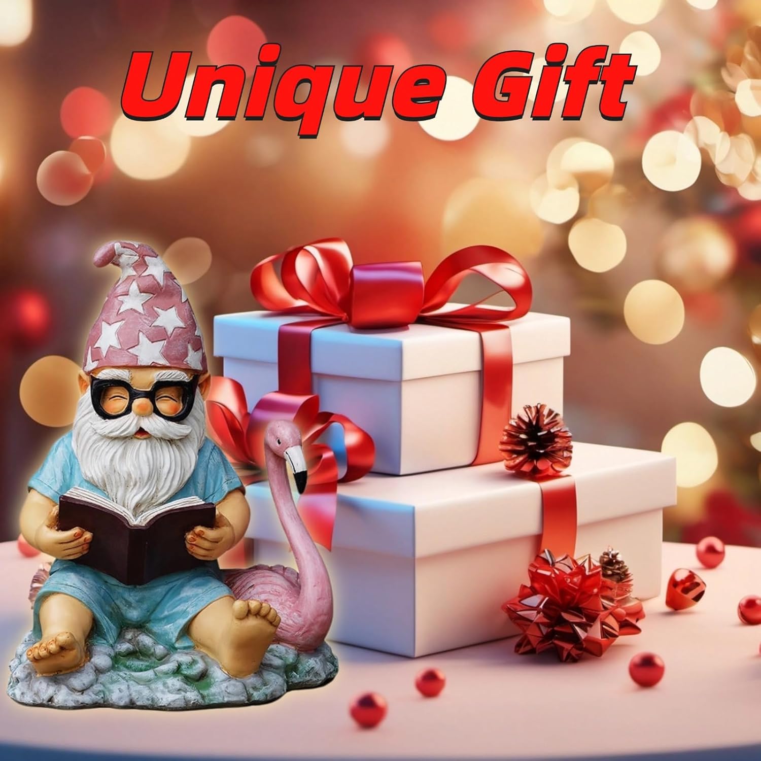 - Unique Appearance Design: This funny statue features a gnome wearing glasses and a pink hat with white stars, engrossed in a book, with an elegant flamingo leaning beside him. This whimsical pairing brings both fun and vibrancy to your garden