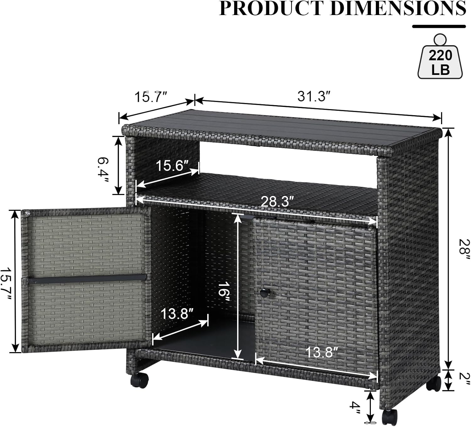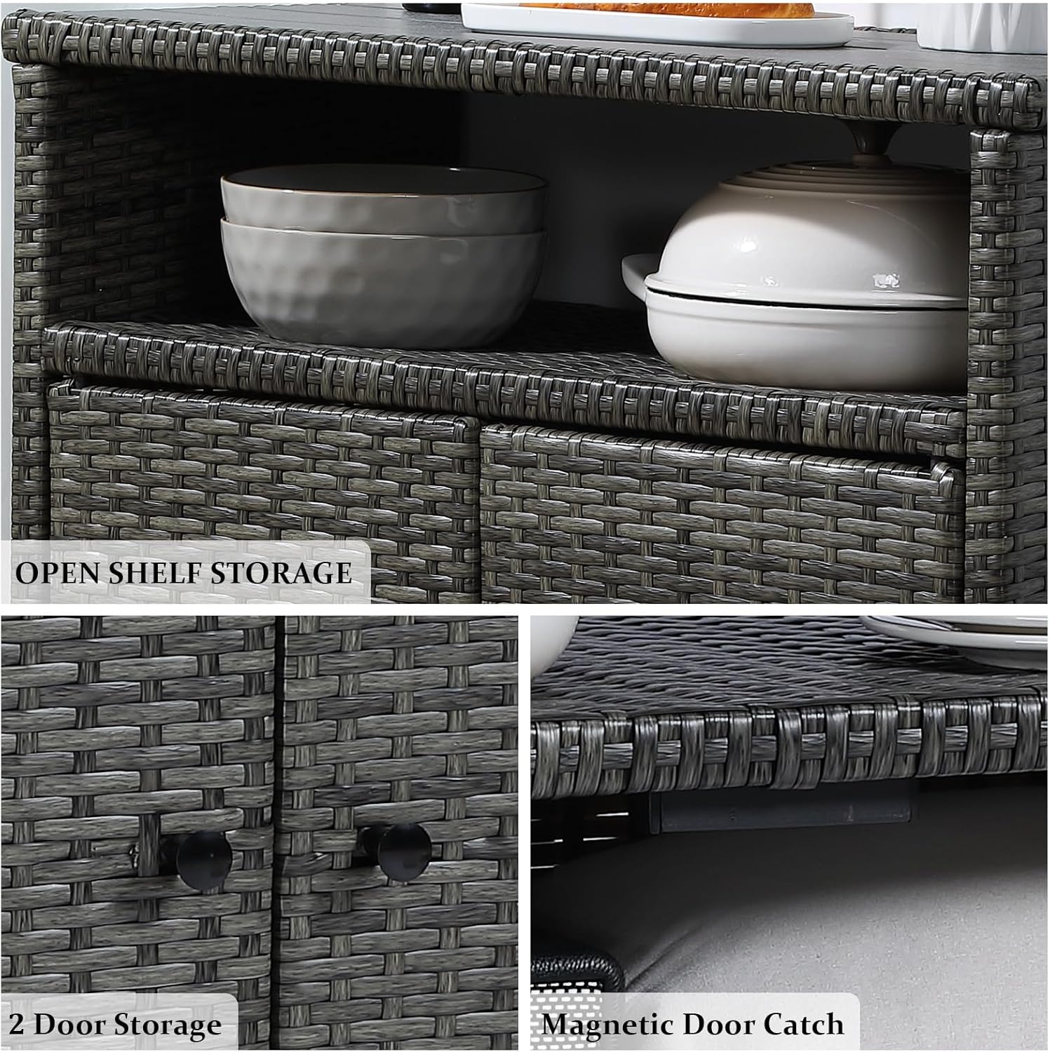 - Large Storage Capacity: Our wicker storage cabinet features a spacious tabletop, an open shelf and an enclosed cabinet. Our cabinet can be used as an outdoor buffet cabinet, garden tools cabinet, or bar table with elegant design