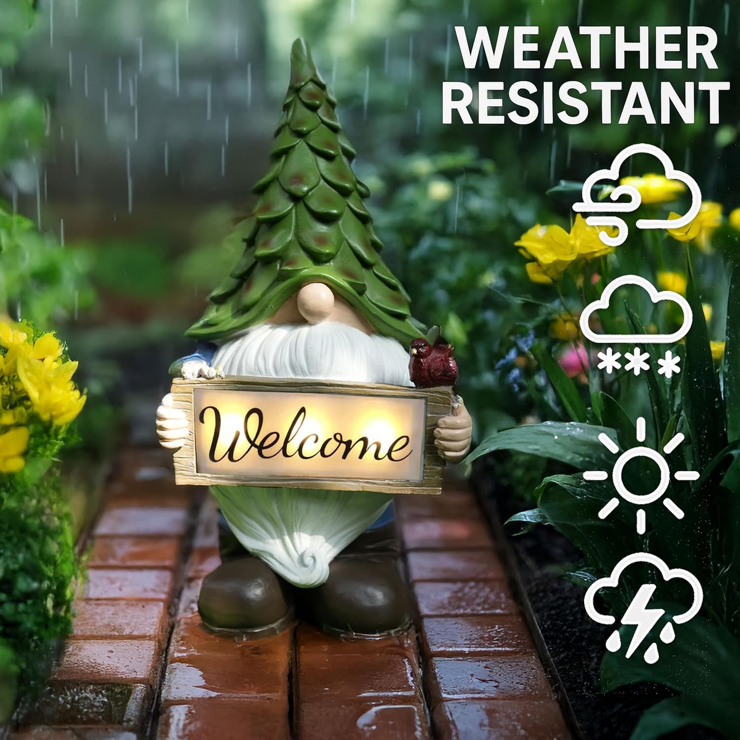 Large Garden Gnome Statue with Solar Lights, 13.5” Welcome Sign Gnome Outdoor Decor for Yard Lawn Patio, Funny Resin Gnome Sculptures, Gifts for Women Mom Grandma,Garden Decor Ornament