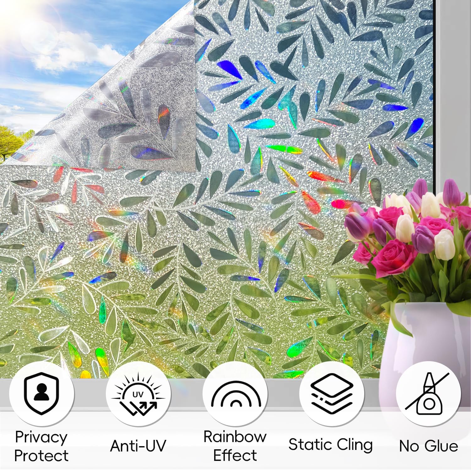 DUOFIRE Window Privacy Film Rainbow Window Film Decorative Leaves Pattern Window Cling Frosted Reusable Anti-UV Non-Adhesive Static Cling Privacy Film for Home Office 35.4 × 78.7 inches
