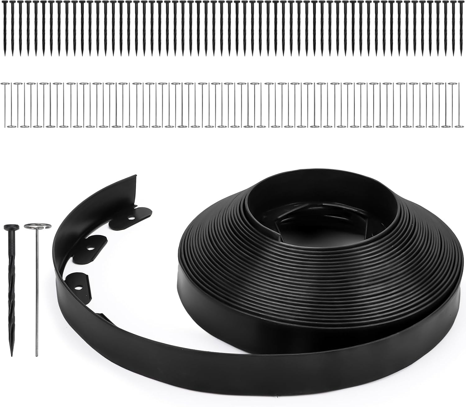 - 【Value Set】This set includes a 66-foot roll of 2-inch high black garden edging, along with 60 spiral plastic anchoring stakes and 70 durable metal G-nails—everything you need for a quick and easy installation to create a stunning landscape.