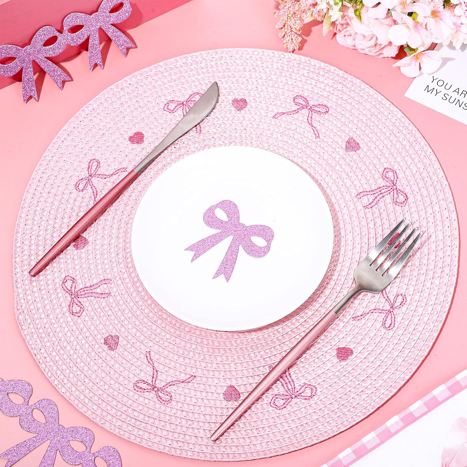 Whaline 4Pcs Round Placemats Pink Bow Embroidered Place Mats Coquette Bow Dinner Table Mats for Home Wedding Baby Shower Birthday Party Decor