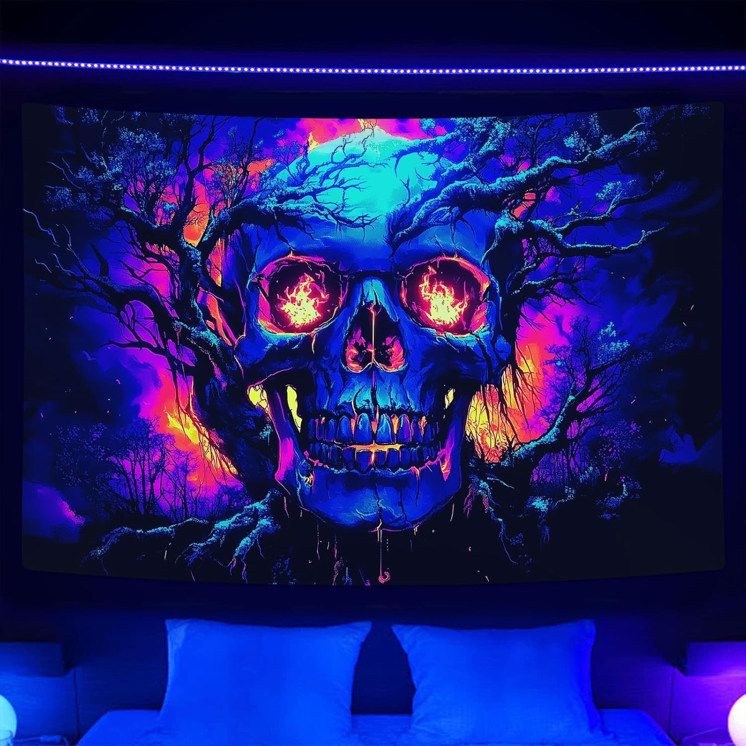 - UV Reactive & Glow in the Dark:This skull skeleton butterfly tapestry under normal lighting, the colors are full and vivid. Under blacklight / UV light, emit a dazzling dark light, creating a different visual experience.