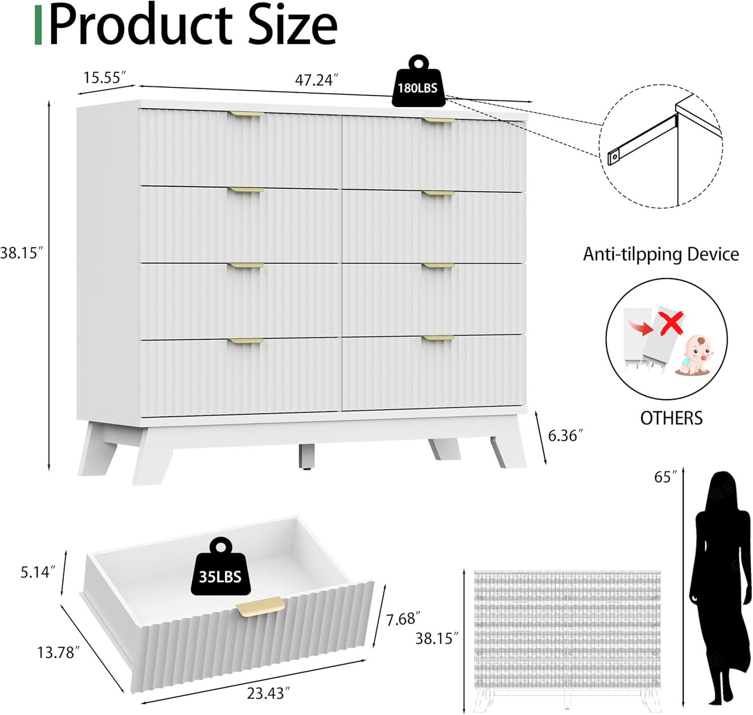 Fluted Dresser for Bedroom with 8 Drawers, 48" Wide Modern Chest of Drawers with Metal Handle, Wooden Dresser TV Stand, Wood Closet Clothes Storage Drawer Organizer for Living Room, Hallway, White