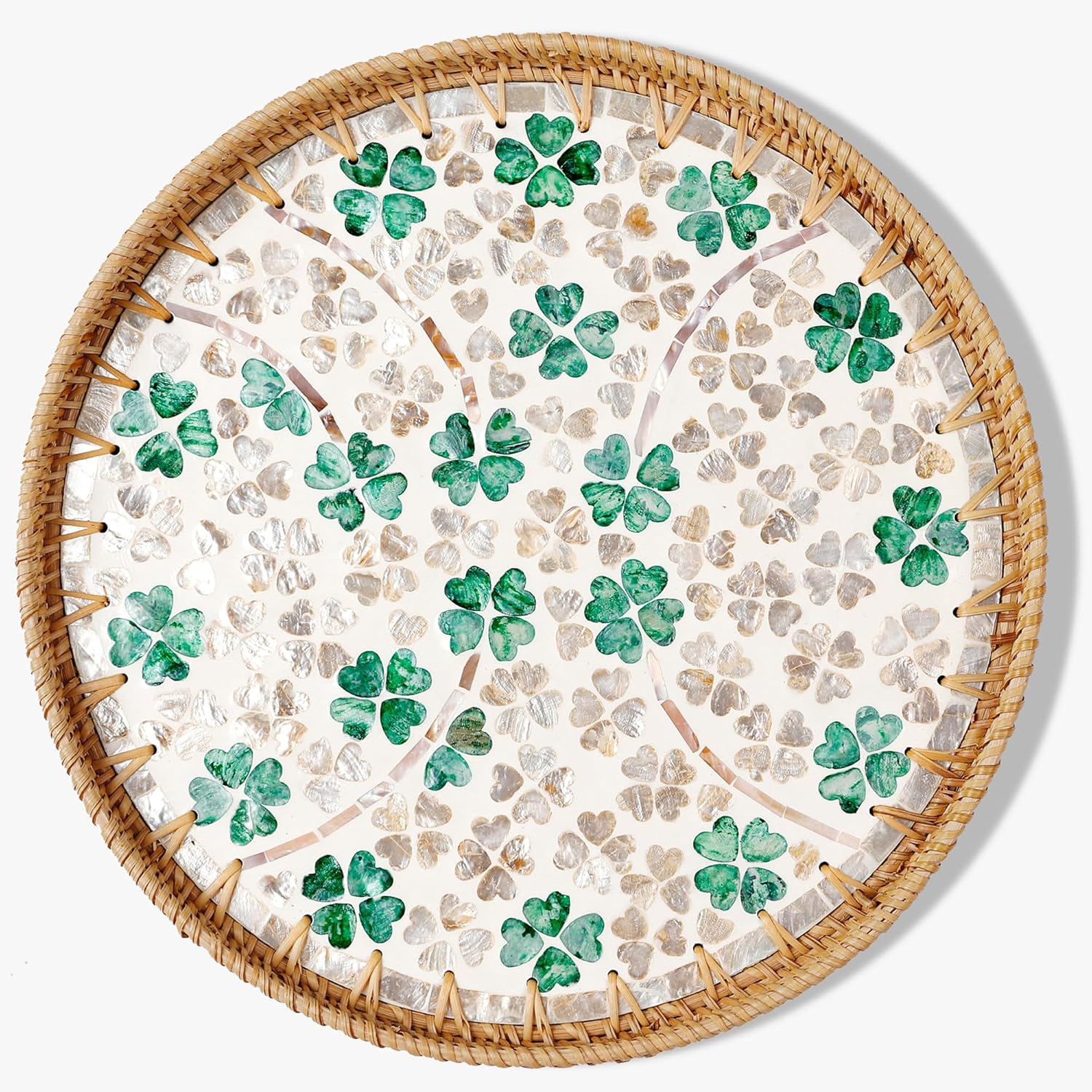 Round Rattan Tray with Mother of Pearl Inlay & Wooden Base - Decorative Wicker Serving Tray for Coffee/Bread/Fruits, Food Storage & Display - Multipurpose Home Decor (L,Four-Leaf Clover)