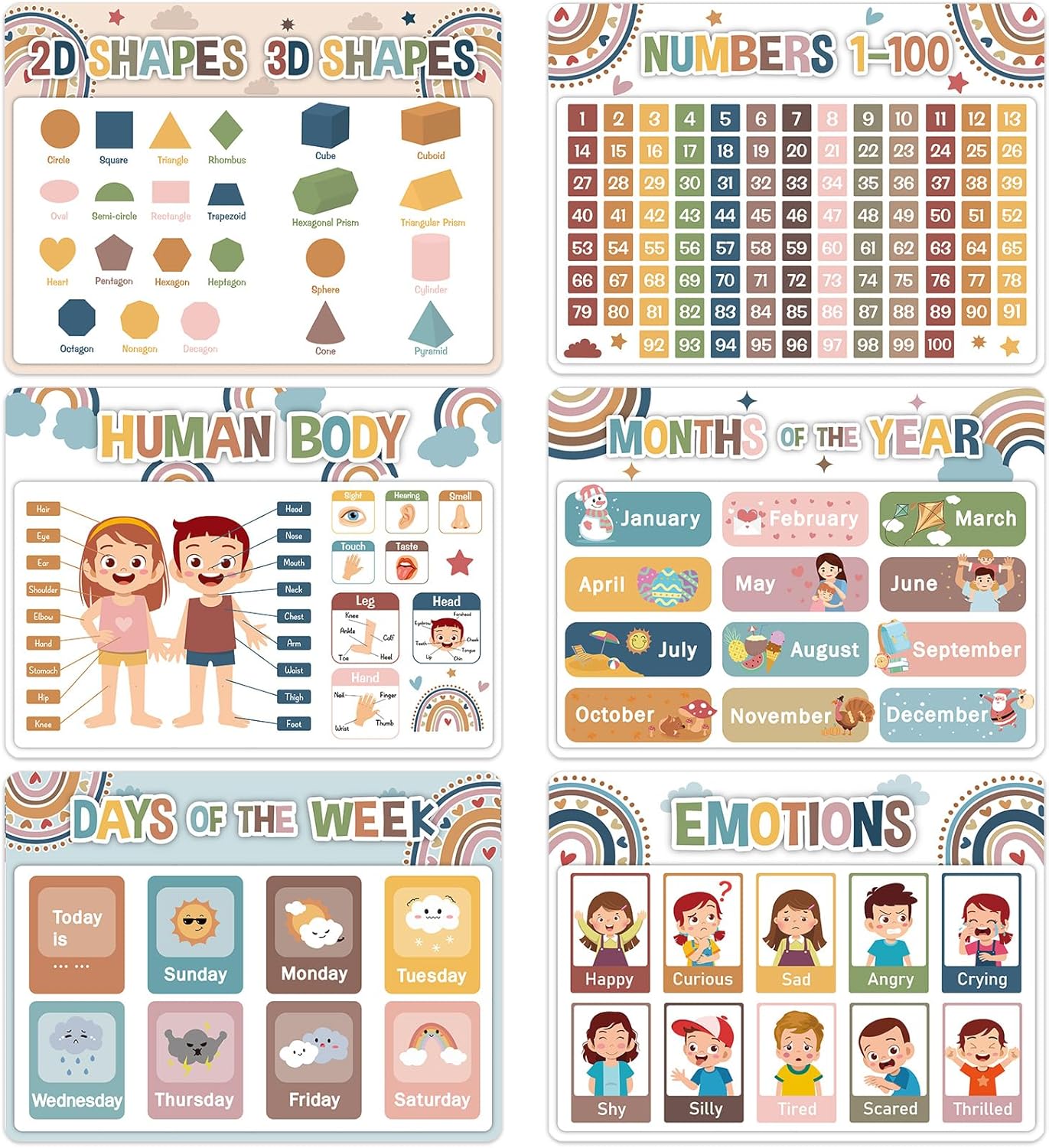 - Educational for kids placemats: You will get 6 preschool education learning placemats, featuring 6 different designs including themes on shapes, the human body, months of the year, numbers, days of the week, and emotions. These engaging and colorful placemats are great for introducing early education to preschoolers and elementary school children. Ideal for homeschooling, preschool, and kindergarten classrooms.