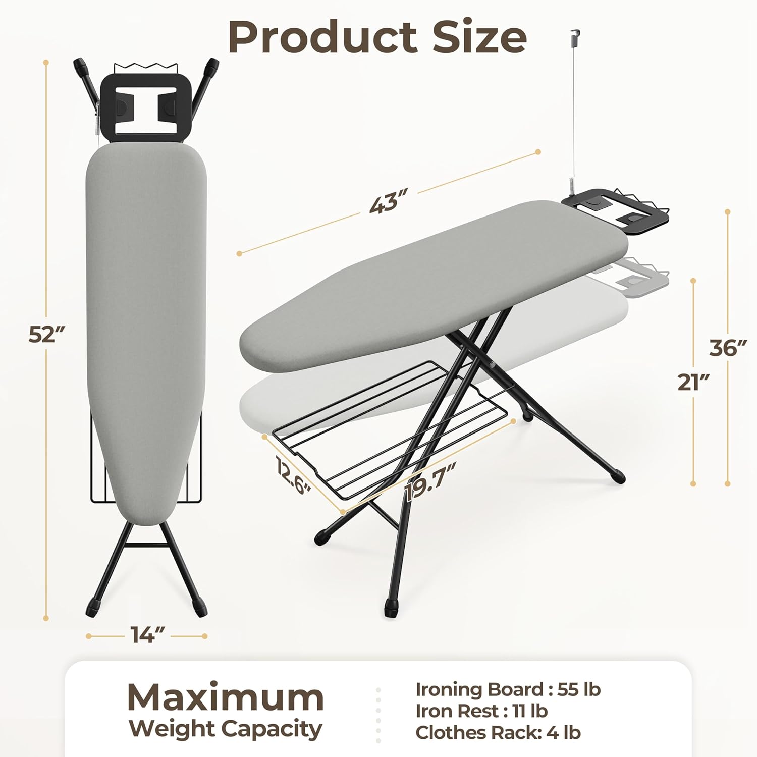 - Full-size Ironing Board: The iron stand provides ample space to meet all your ironing needs. The 43âł LĂ 14âł W surface ensures an efficient ironing and sewing experience and is ideal for larger garments