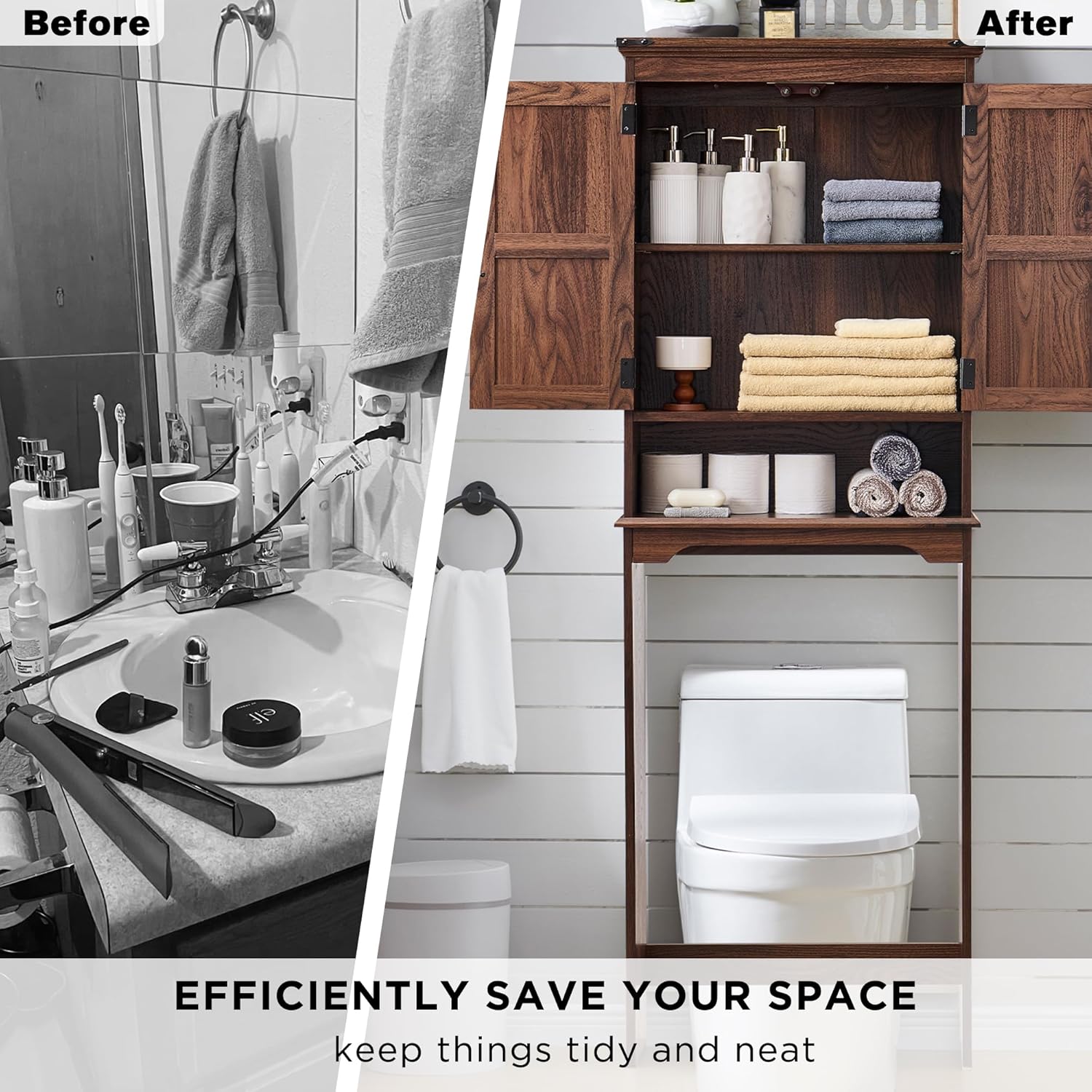 - [Adjustable Shelf]: The adjustable shelf design easily adapts to the size of your belongings. Whether it's a large item or a small accessory, you will be able to find the most suitable placement. Let your bathroom supplies are no longer a cluttered pile. L-shaped metal bracket have more enhanced support and stability, no need to worry about the shelf tilting. The Farmhouse Over-Toilet Cabinet is the embodiment of your sophisticated lifestyle.
