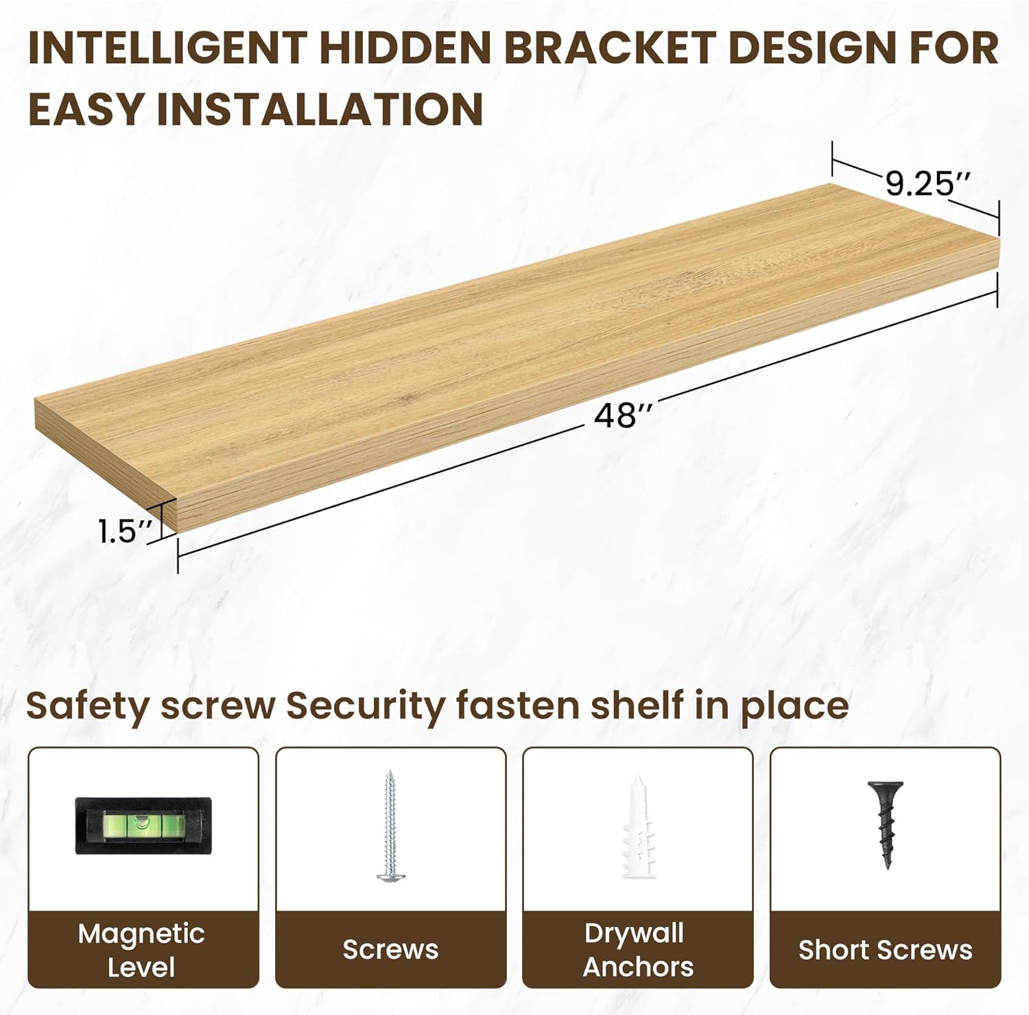 48 Inch Floating Shelves, 12 Inch Deep Floating Shelves for Wall, Large Floating Shelf with Invisible Brackets, Deep Shelves for Bathroom, Bedroom, Living Room, 1 Pack, Natural