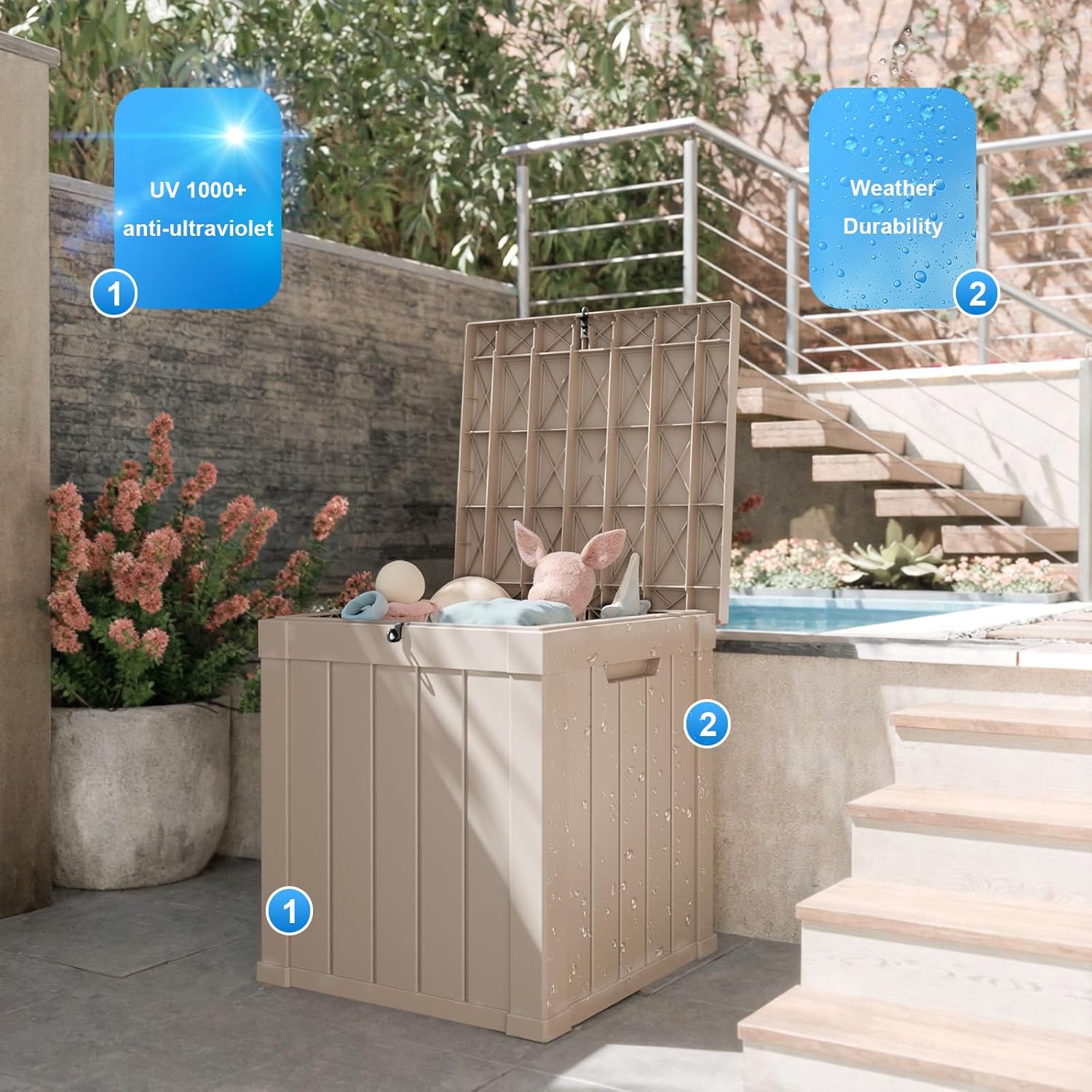 - YEAR-ROUND DEFENSE: The aggregate resin with a wood grain pattern on this deck storage box delivers a blend of beauty and functionality. It's equipped with waterproof, UV-resistant, fade-resistant, rust-resistant, peel-resistant, and warp-resistant features, requiring minimal maintenance over the next several years