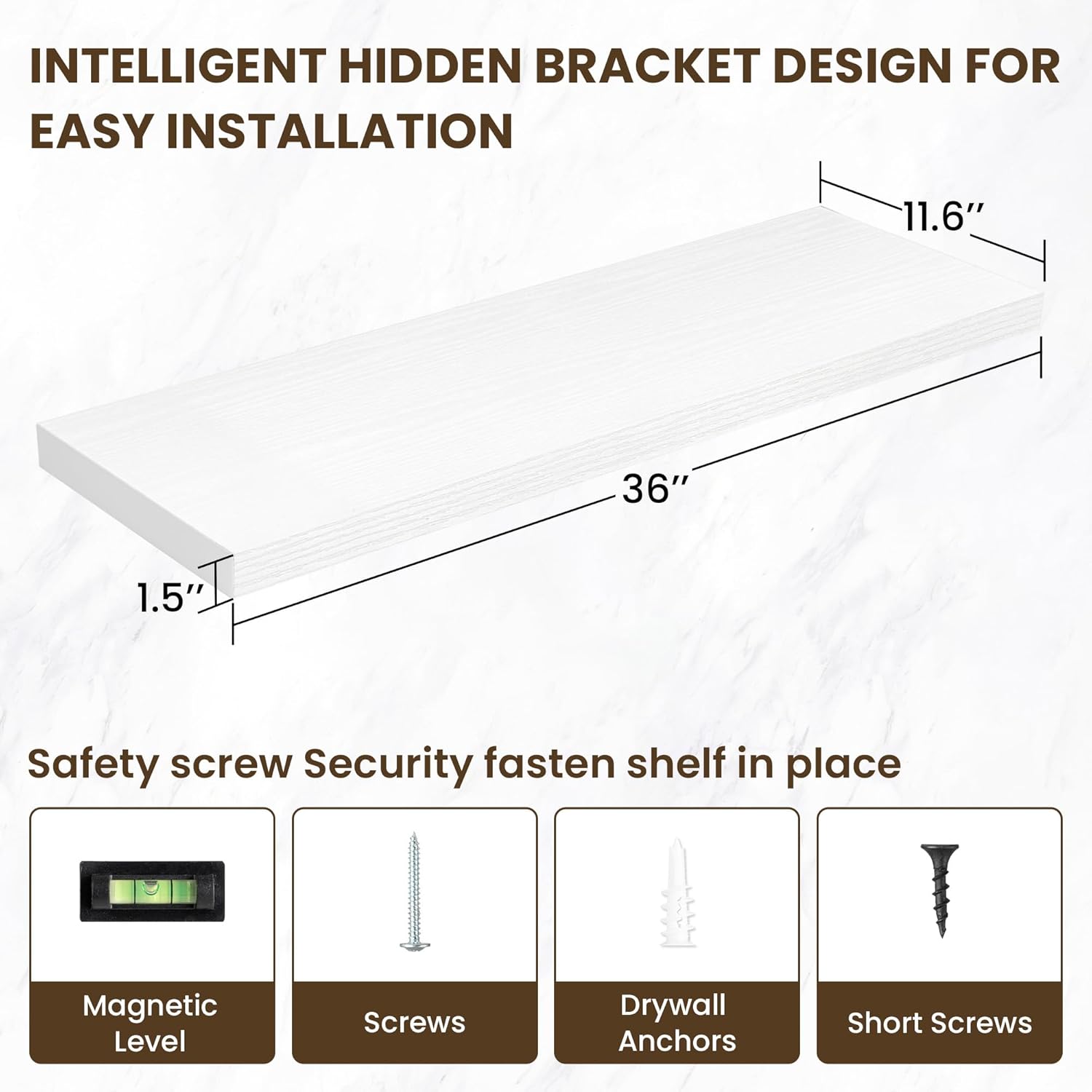 - ăEasy InstallationăDesigned with user convenience in mind, these shelves come with all necessary mounting hardware and clear instructions. You can have them up and ready to use in less than 5 minutes. Plus, our customer service is always ready to assist with any queries or concerns, ensuring a hassle-free experience