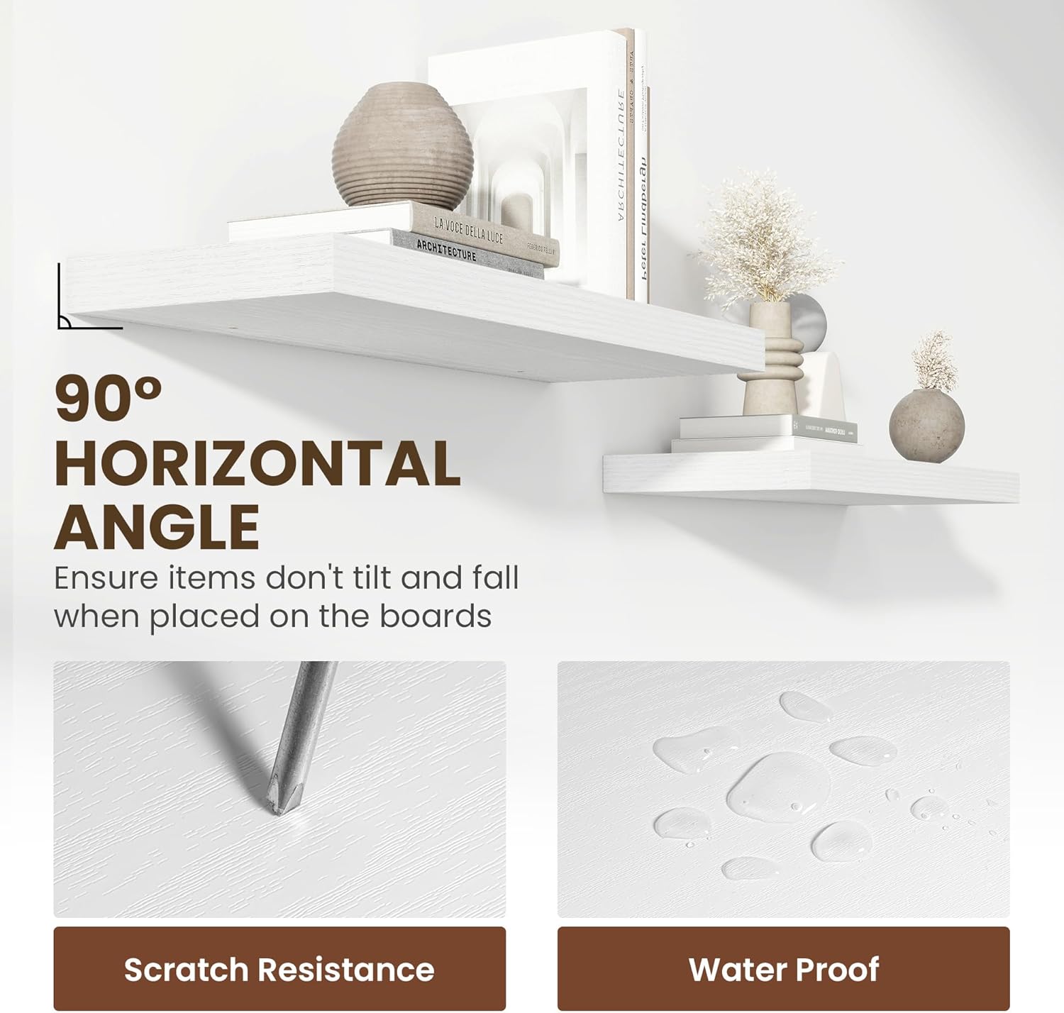 - ăPremium Quality ConstructionăCrafted from high-grade engineered wood with an invisible one-piece bracket, these floating shelves offer a robust and sleek design. The rustic wooden grain finish not only adds a touch of elegance but also infuses warmth into any room, making them a perfect fit for both modern and traditional interiors.