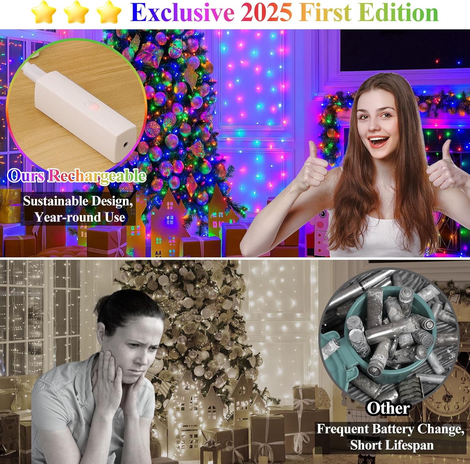 - 2025 Specially Developed Battery String Lights: Say goodbye to disposable batteries and embrace sustainability! Our rechargeable Type-C power bank (cable included) powers the fairy lights for 30+ hours of cordless glow. When it’s time to recharge, simply detach the compact, lipstick-sized power bank—no need to move the entire string lights. Designed with an innovative, patented structure, this power bank offers a smarter, greener way to shine