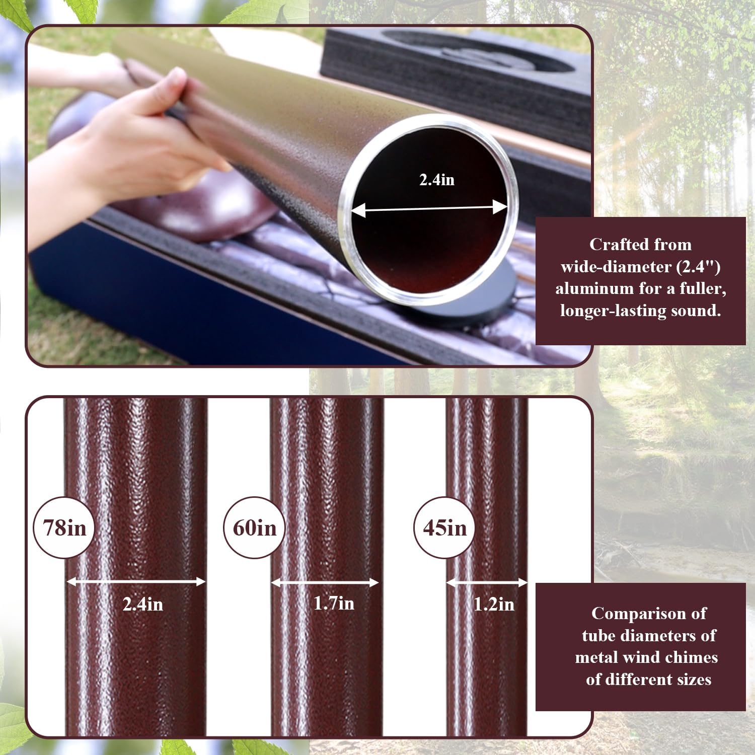 - 78 Inch large Wind Chimes - The longest tube of the large wind chimes is 47.6 Inch,diameter is 2.4 Inch.6 aluminum powder-coated tubes,every metal tube of this large wind chime is hand-tuned by our professional tuning experts to achieve a superior musical performance.Heavy duty nylon cording high density striker for a clear tone and resonances.