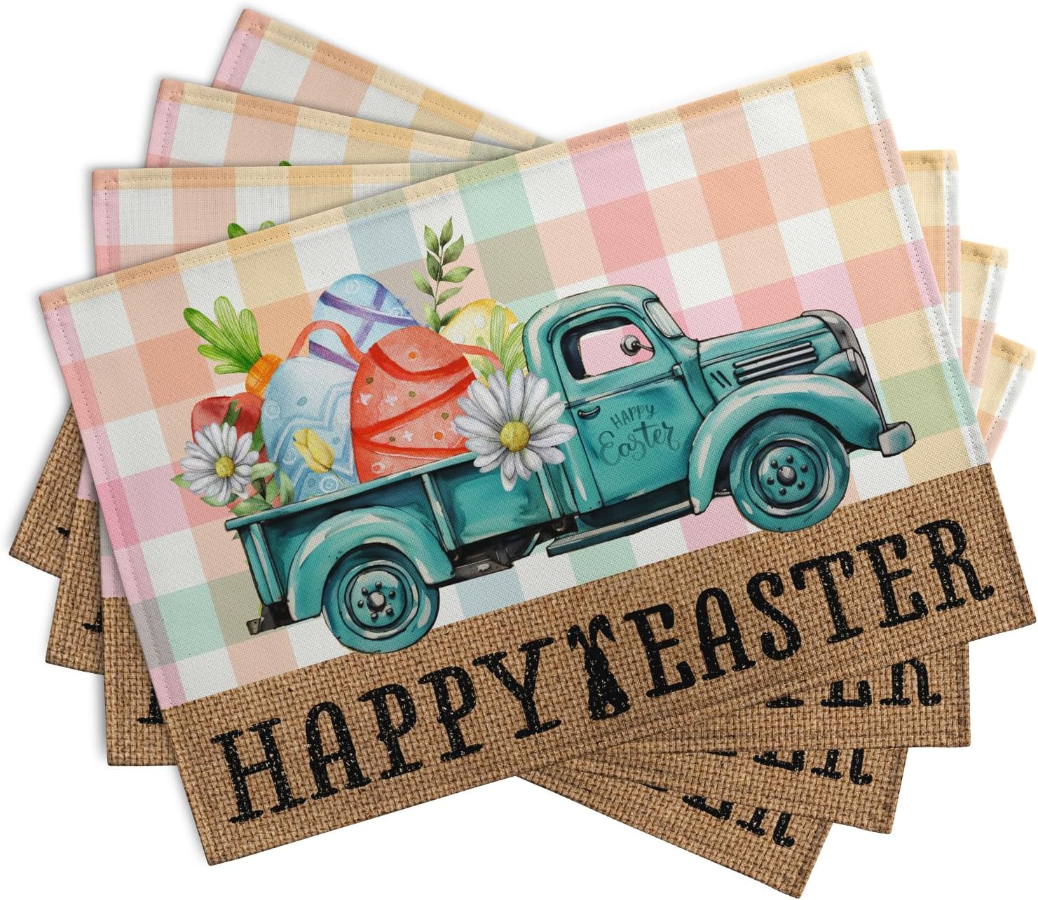 - TABLE DECORATION: Easter egg truck table place mats feature high-definition printing technology for crisp, clear patterns and vibrant colors; colorful buffalo plaid placemats with a cute truck pattern; unique and eye-catching seasonal patterns add charm to spring easter placemats, creating a festive atmosphere for your party