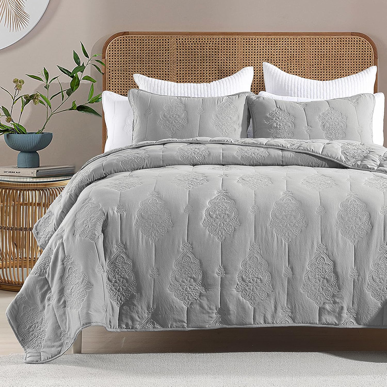 HORIMOTE HOME Grey Quilt Queen Size Floral Quilt Bedspread Lightweight Soft Pre-Washed Microfiber Bedcover, 3 Pieces Thin Comforter Bed Cover Bedding Set for All Season