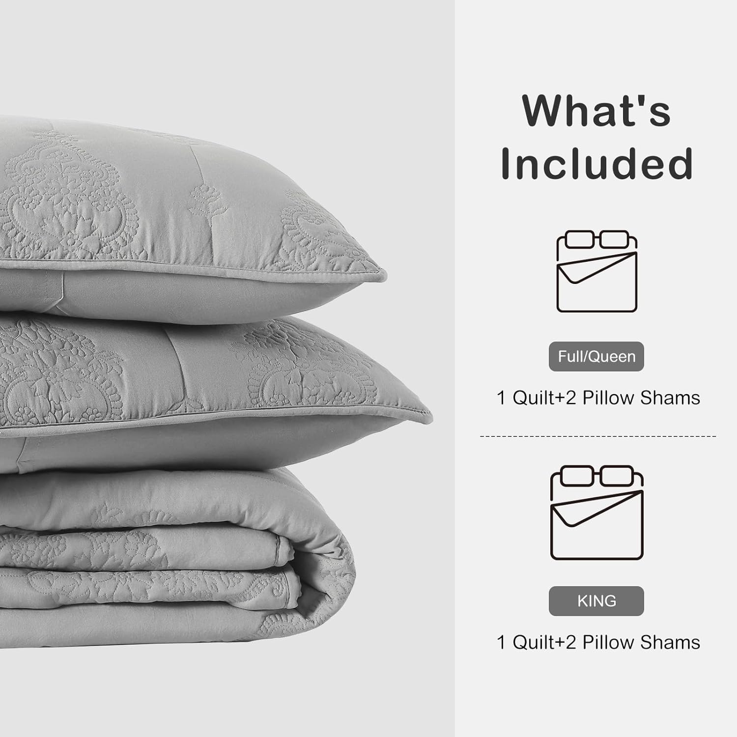 HORIMOTE HOME Grey Quilt King Size Floral Quilt Bedspread Lightweight Soft Pre-Washed Microfiber Bedcover, 3 Pieces Thin Comforter Bed Cover Bedding Set for All Season