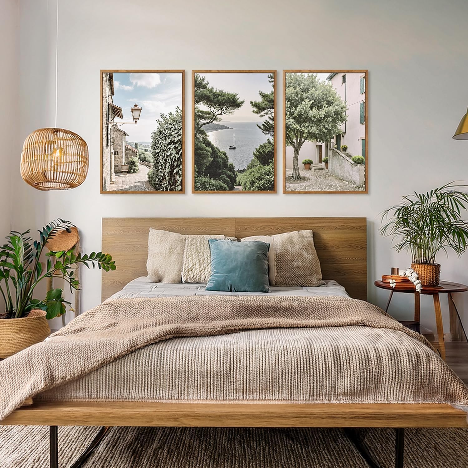 - Italy Cityscape Wall Decor-- Aurlan boho landscape canvas artwork is a 3-piece wall art of the scenery along the Mediterranean coast, featuring ancient architecture, green trees, and distant seascapes. It collectively creates a tranquil and beautiful Mediterranean ambiance.
