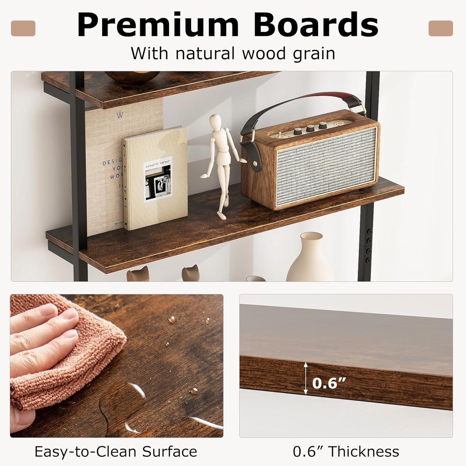 - [Industrial Elegance]: Embrace the stylish fusion of rustic wood-grain finish and sleek matte black metal frame. Our pipe shelving unit embodies industrial chic, making it an ideal showcase for any room seeking a contemporary upgrade.