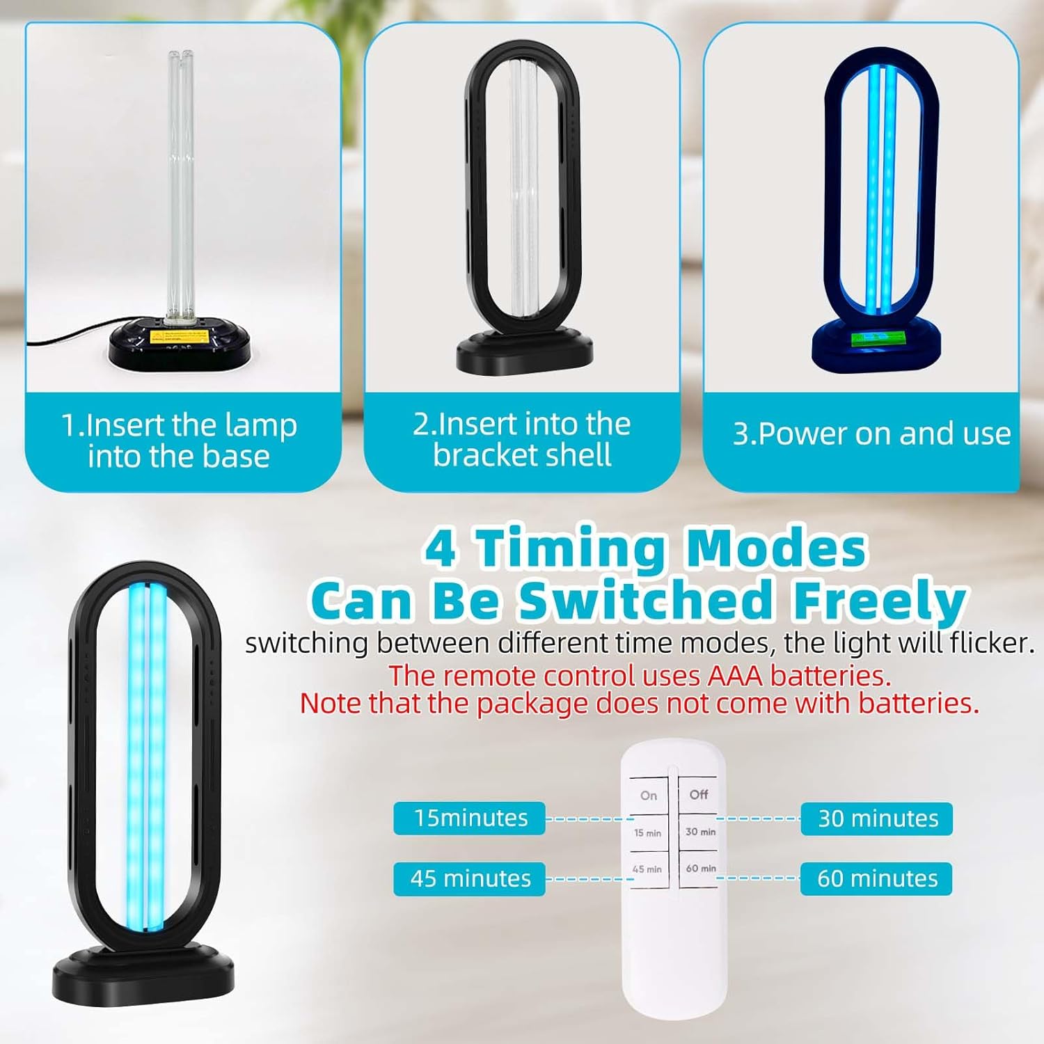 - Convenient Timing: The UV light sanitizer has 4 timing modes, the remote control uses AAA batteries. (Batteries are not included in the package.) It can be timed by remote control for 15/30/45/60 minutes.