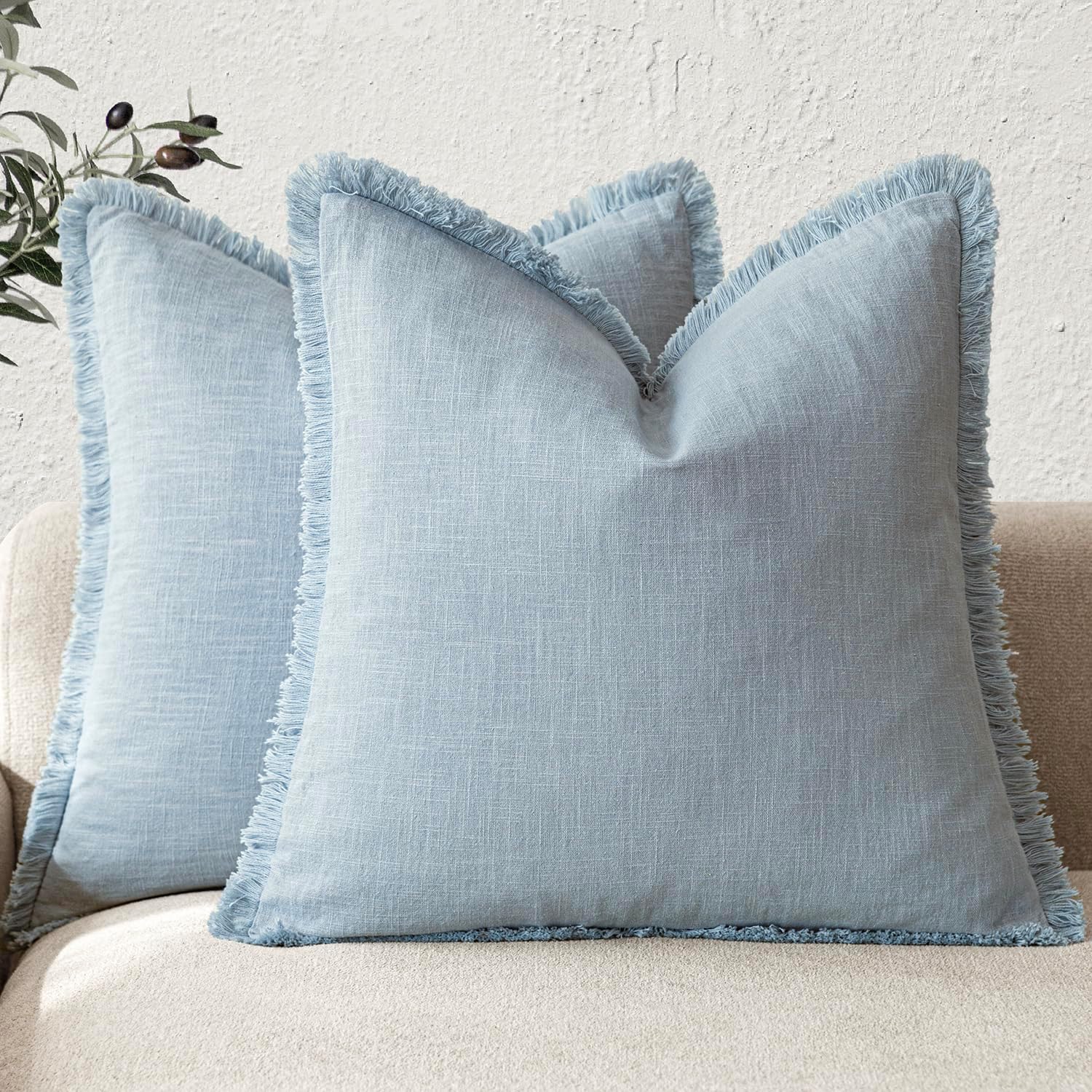 Foindtower Set of 2 Decorative Linen Fringe Throw Pillow Covers Cozy Boho Farmhouse Cushion Cover with Tassels Soft Accent Pillowcase for Couch Sofa Bed Living Room Home Decor,26×26 Inch,Sky Blue