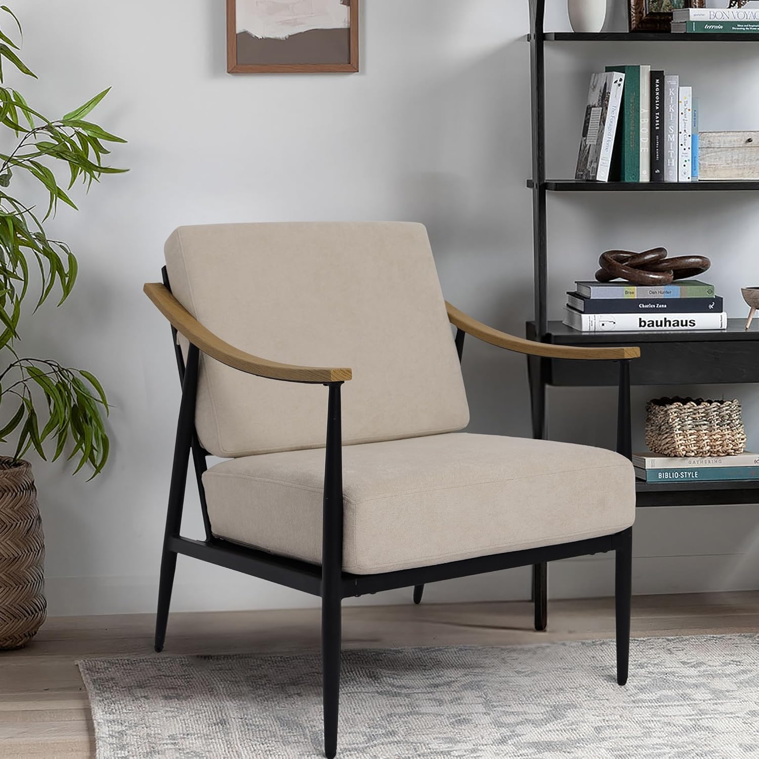 - Please Your Eyes - Designed in a unique mid-century modern style, the curved imitation wood-grain METAL armrests provide a unique and stylish look, while the solid metal frame and linen fabric add a modern touch. With a sleek and modern design that incorporates retro elements, this accent chair will add a touch of sophistication to any room