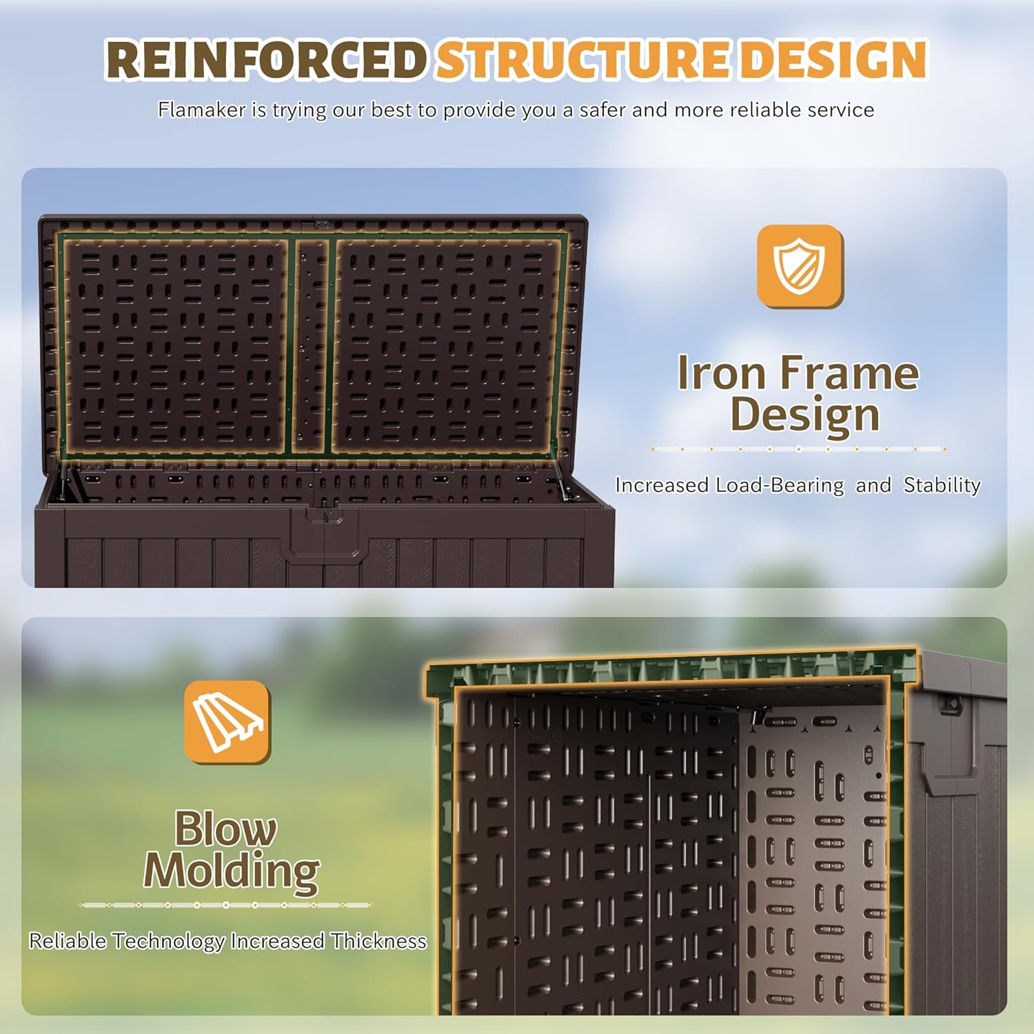 - [As a Seat] Flamakerβs large outdoor storage deck box, not only guarantees the storage capacity, but can be used as a seat, which can be used by up to 2 people