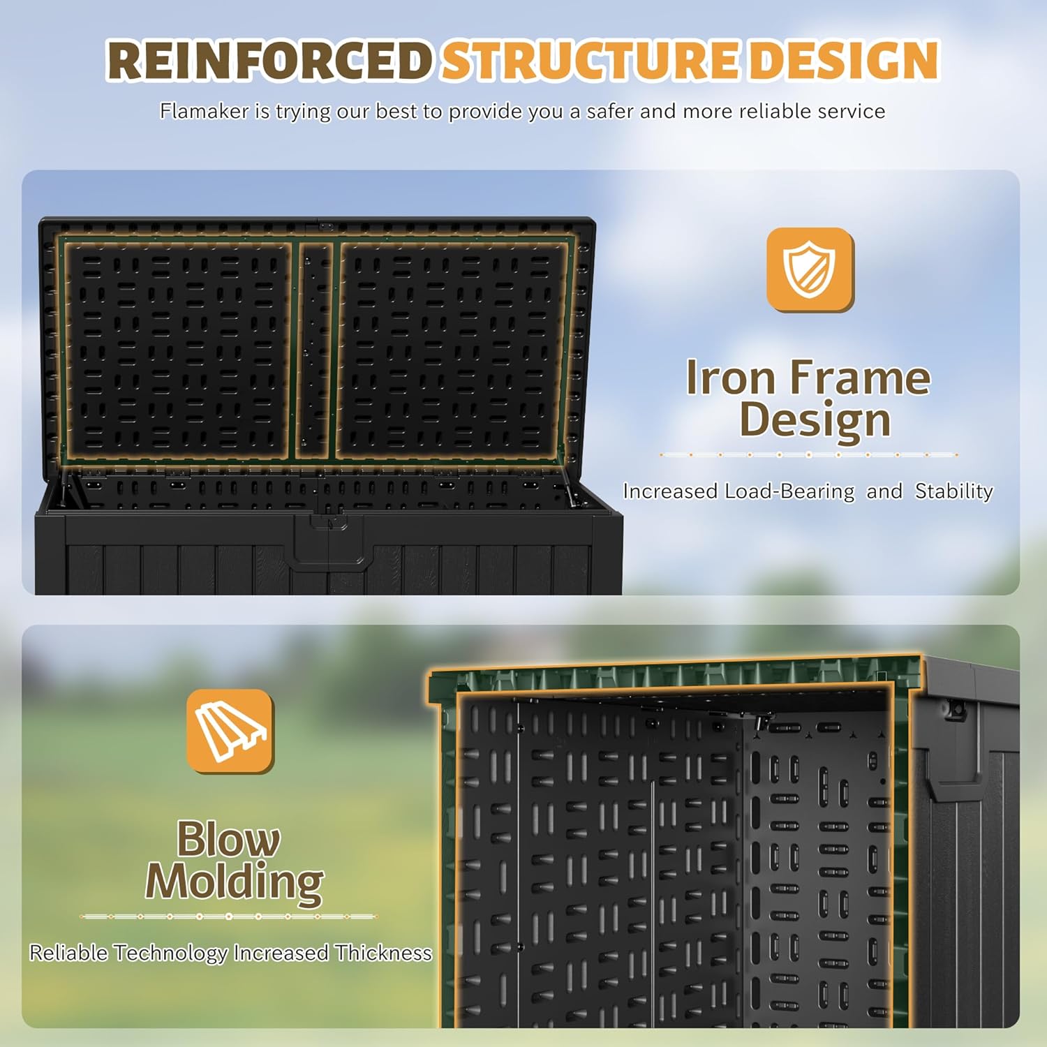 - [As a Seat] Flamakerβs large outdoor storage deck box, not only guarantees the storage capacity, but can be used as a seat, which can be used by up to 2 people