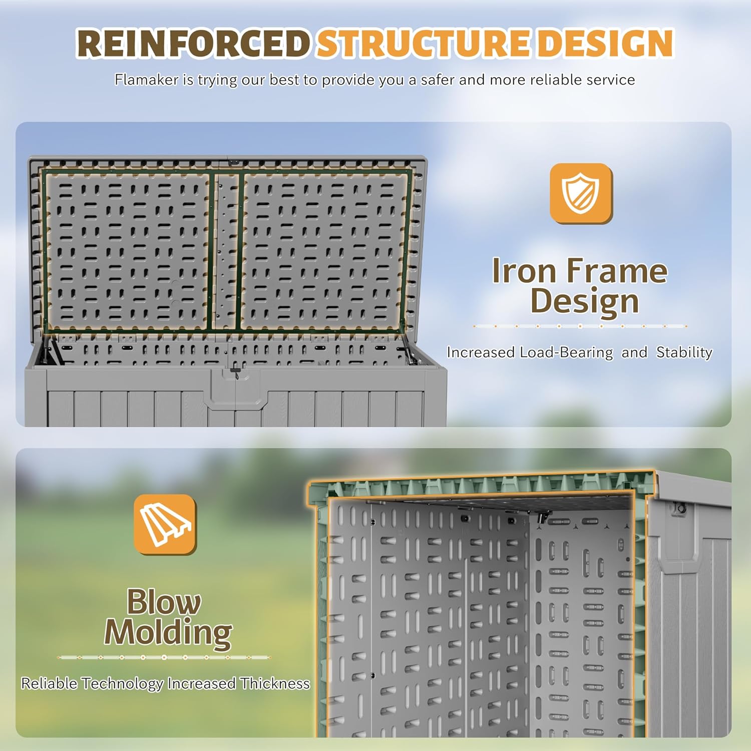 - [As a Seat] Flamakerβs large outdoor storage deck box, not only guarantees the storage capacity, but can be used as a seat, which can be used by up to 2 people