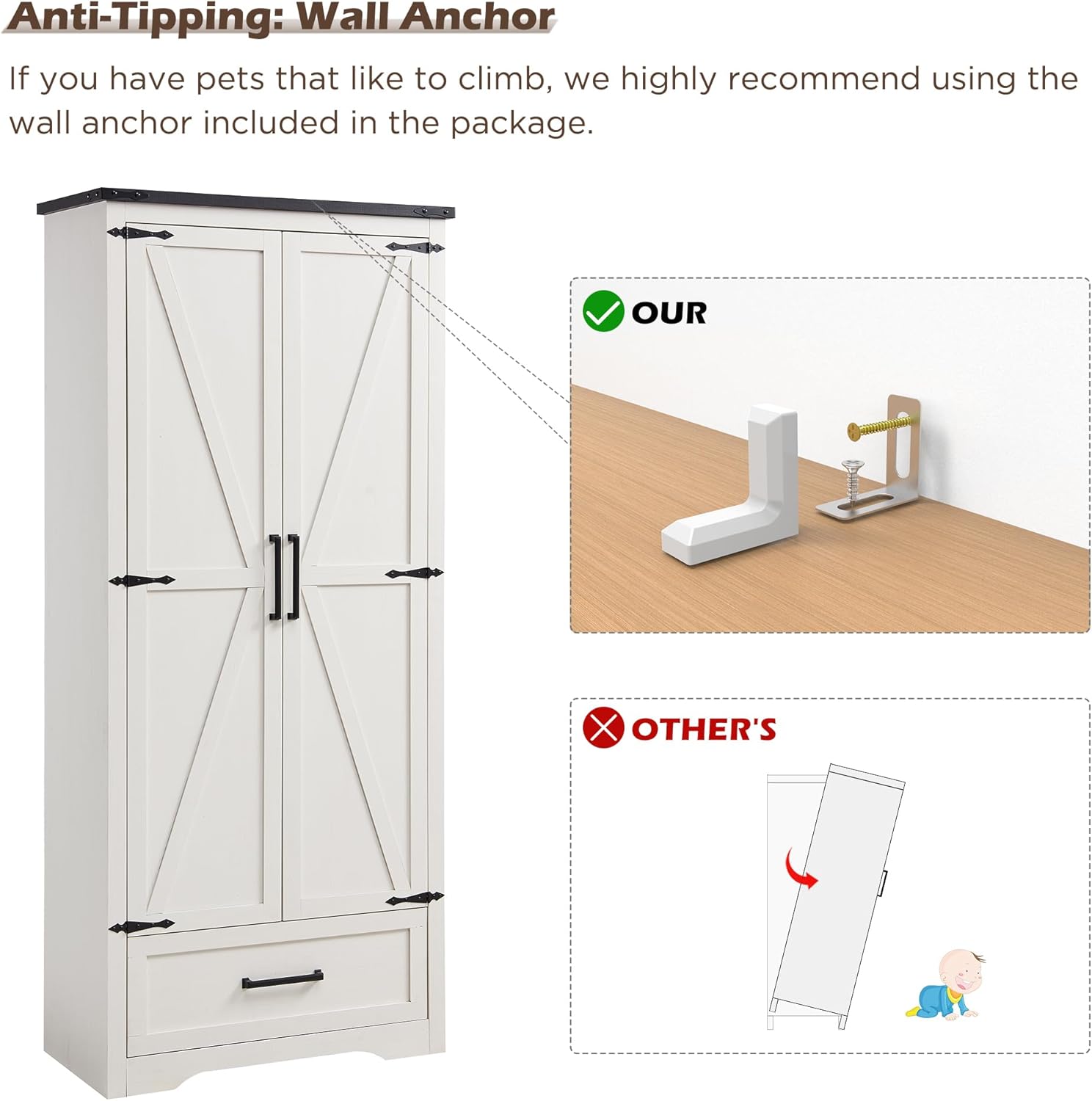 72" Tall Wood Storage Cabinet, Farmhouse Kitchen Pantry Cabinet with Adjustable Shelves & Drawer & Barn Doors, Versatile Storage for Kitchen, Dining Room, Bathroom, Antique White