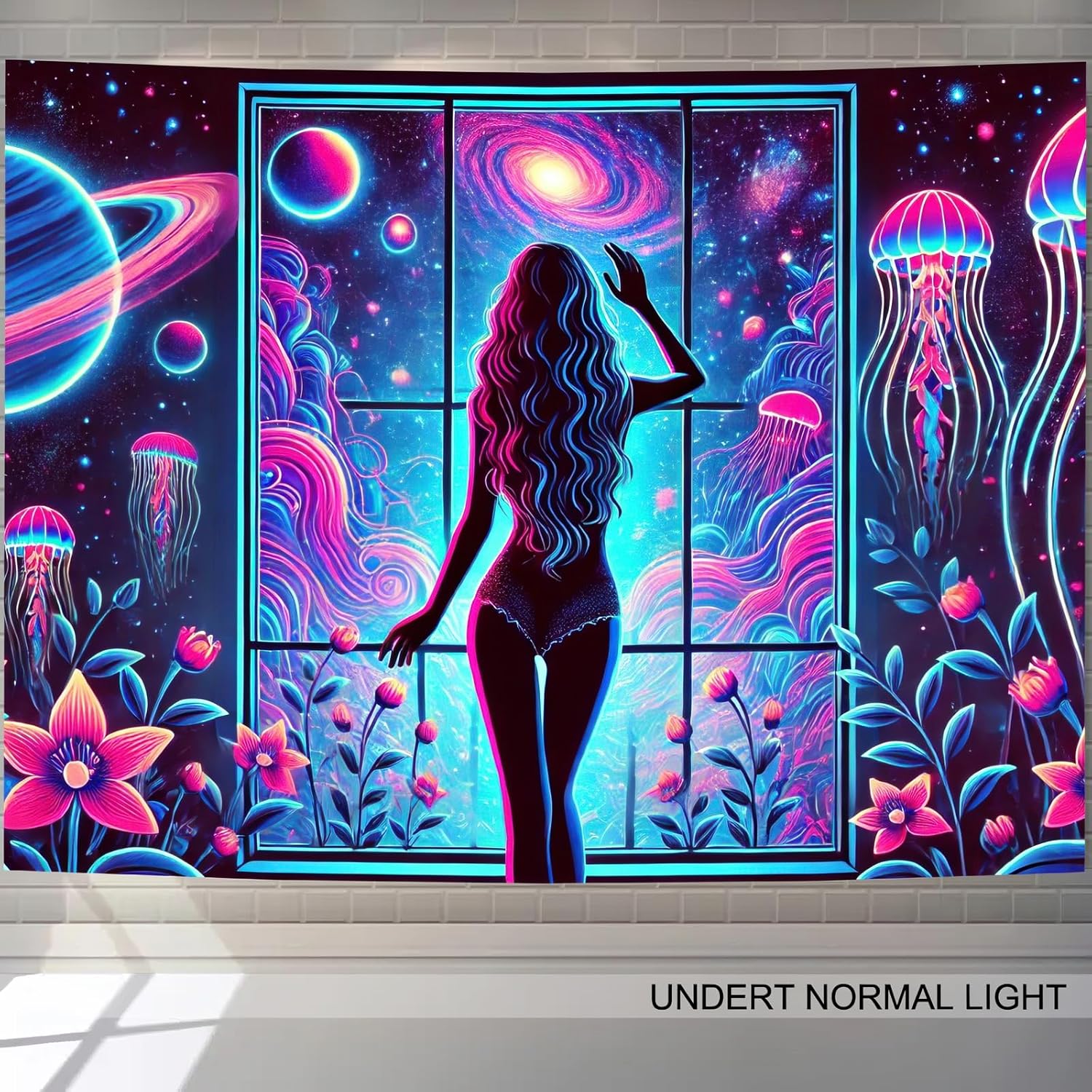 - 【Cosmic Neon Window Design】This blacklight tapestry features a stunning, neon-infused scene of a woman gazing out a window into a cosmic world. The view includes glowing planets, swirling galaxies, and luminous jellyfish, set against a vibrant pink and blue color palette.