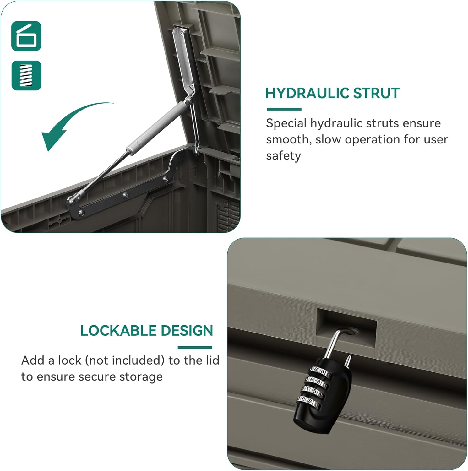 - Versatile and Secure: Our resin storage box is designed for both indoor or outdoor use, suitable for storing patio furniture cushions, gardening tools, pool accessories, and more; The deck box with lock design ensures your items stay safe and secure(Locks not included)