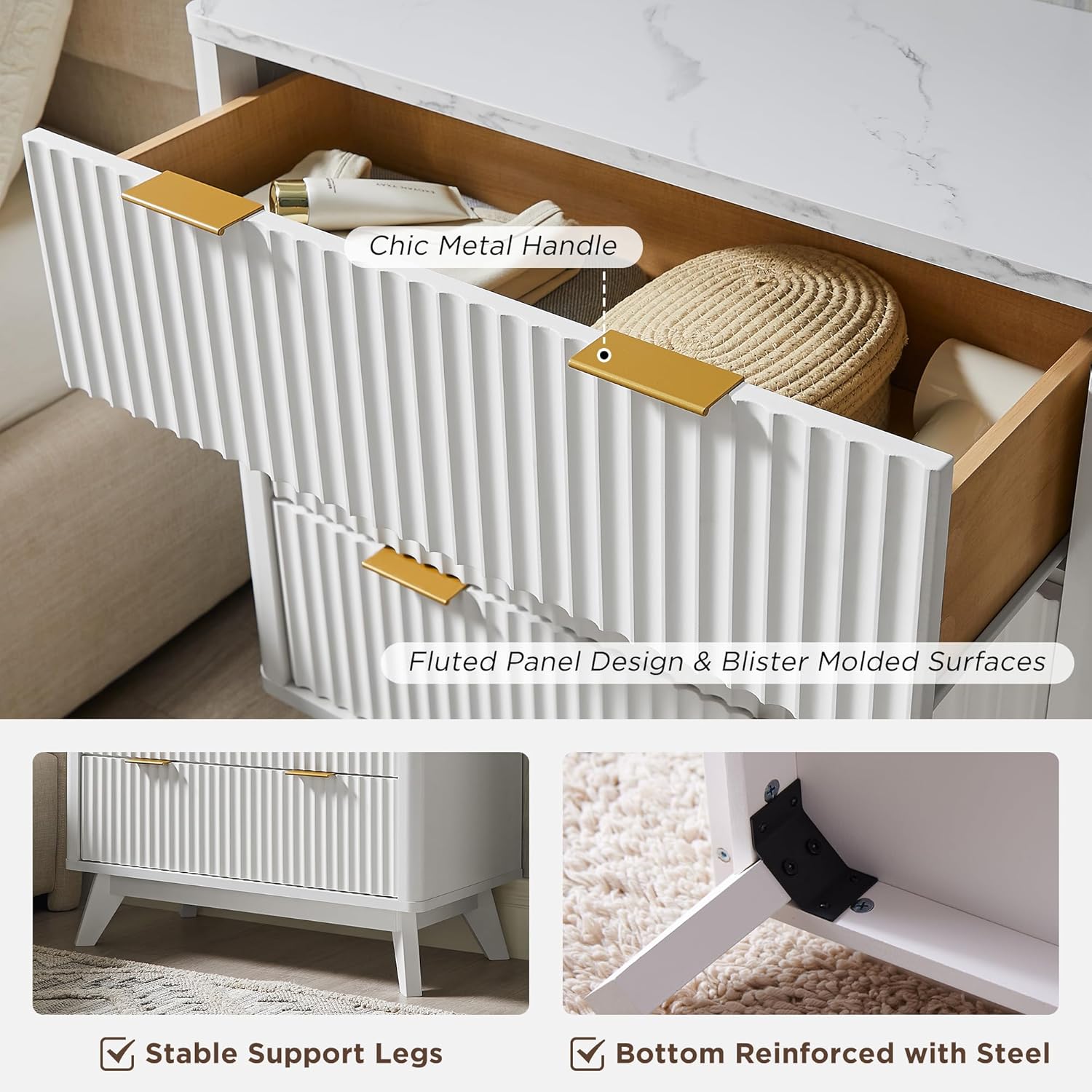 T4TREAM 32" Tall Fluted Nightstand, Modern Side Table with Faux Marble Top, 3 Drawers End Table w/Storage, Bedside Table for Bedroom, Living Room, Curved Profile Design, Solid White