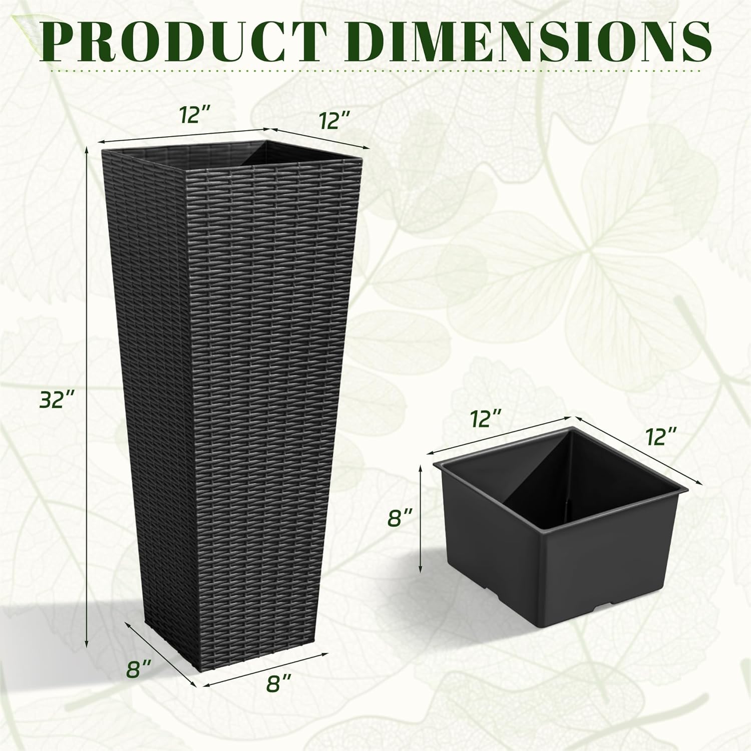 JUMMICO Set of 2 Resin Rattan Tall Planters for Outdoor Plants, Large Tapered Planters with Drainage Holes&Inner Trays, Flower Pots for Garden, Patio, Porch, Backyard (Black, 32'')