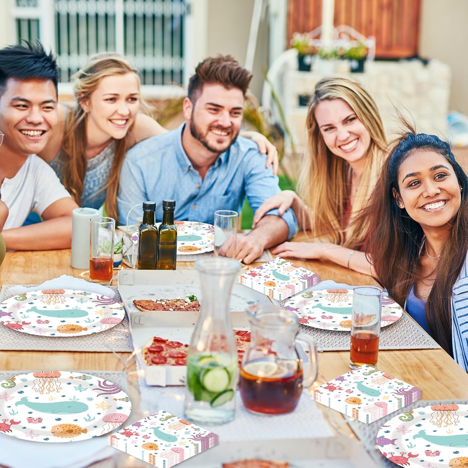 - Instant Party Atmosphere:Create cohesive ocean decor effortlessly—these party paper plates and napkins coordinate with tablecloths, cups, and birthday party banners.