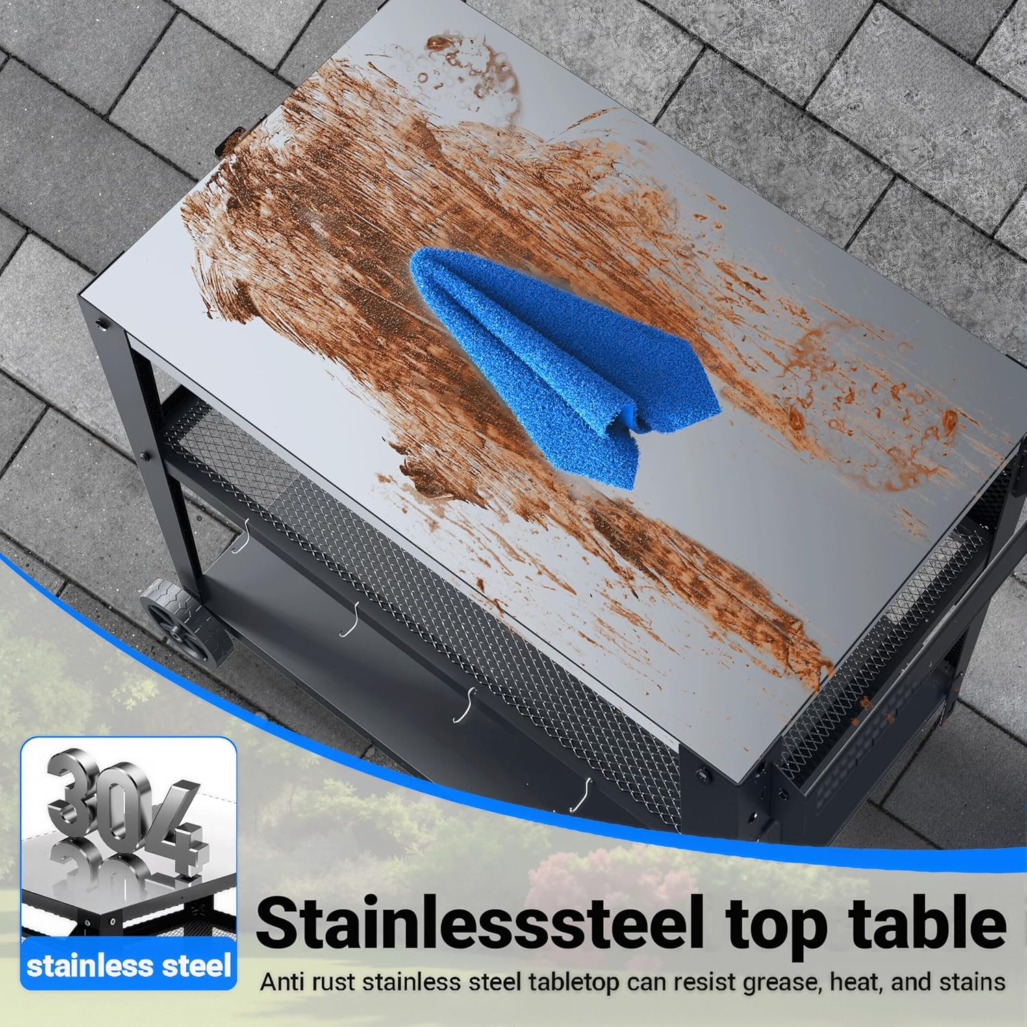 3-Shelf Outdoor Grill Table & Pizza Oven Cart with Wheels, Stainless Steel BBQ Prep Table with Hooks, Mobile Grill Stand for Blackstone/Ooni (Stainless Steel)