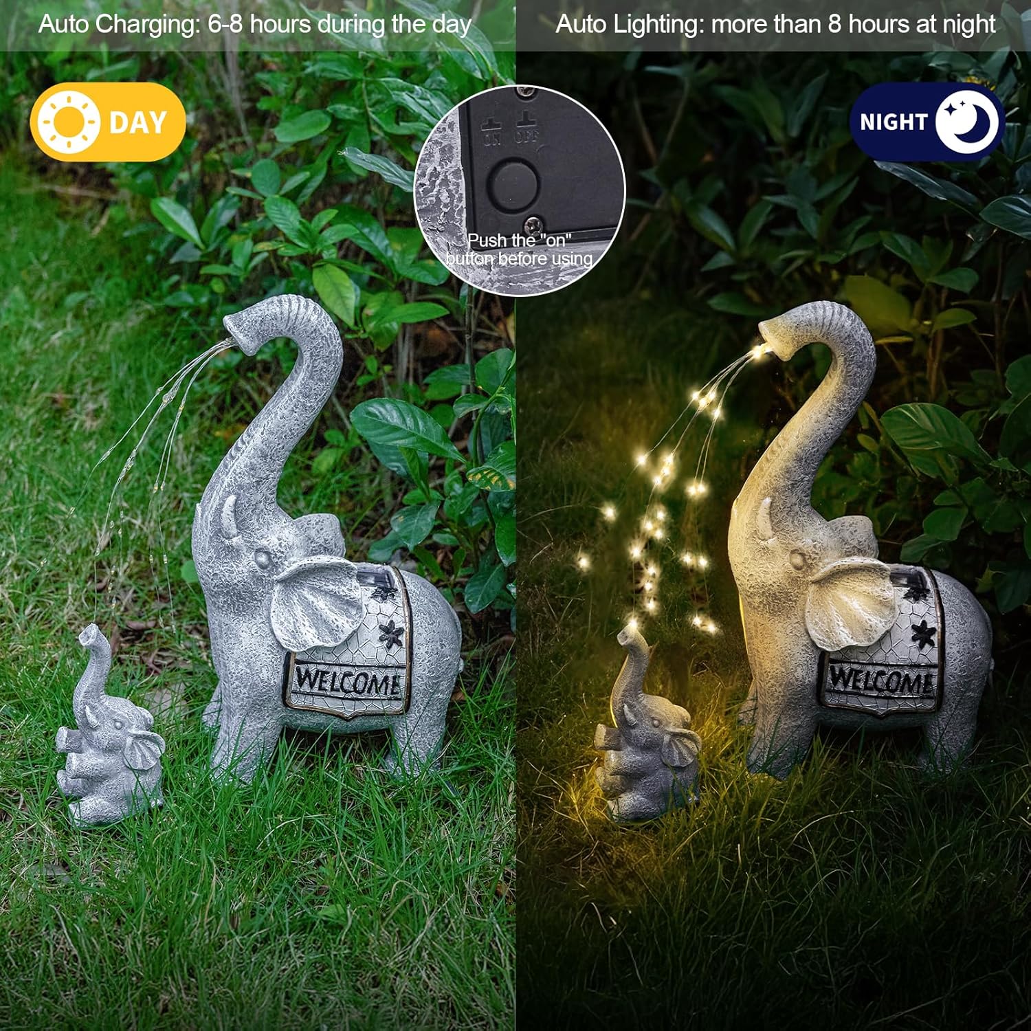 - [Charming Elephant Solar Lights Set] This outdoor figurine set features a large 5.71x7.56in resin elephant with LED string lights simulating a water spray, and a smaller 2.24x4.84in decorative elephant statue. Perfect for garden decor, outdoor decor, yard decorations outdoor, and garden accessories