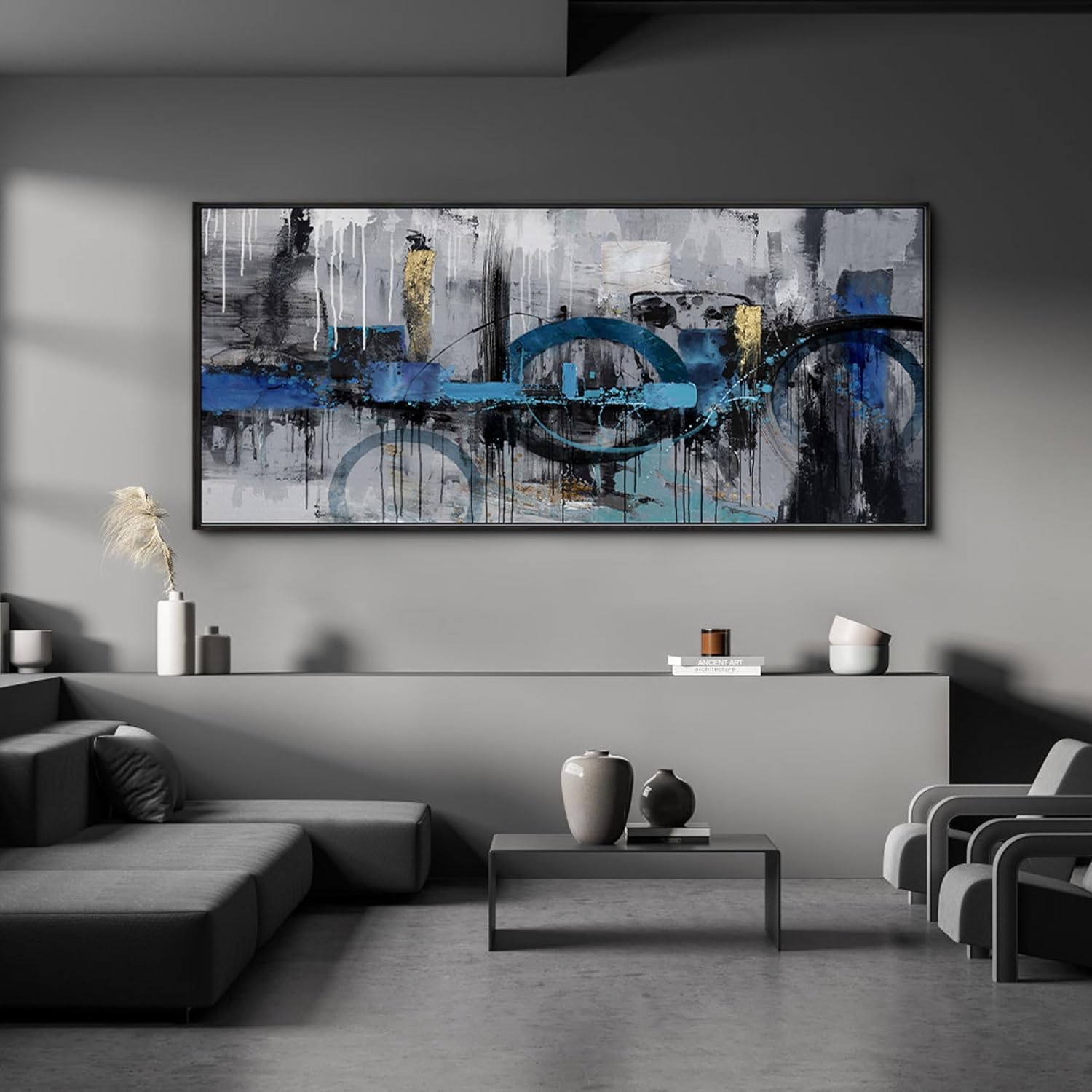 KLAKLA Large Abstract Wall Art Canvas - Blue and Gray Lnk Style Gold City Scenes Wall Decor Living Room Bedroom Decoration Black Frame Picture Artwork for Wall Modern Landscape Wall Decor