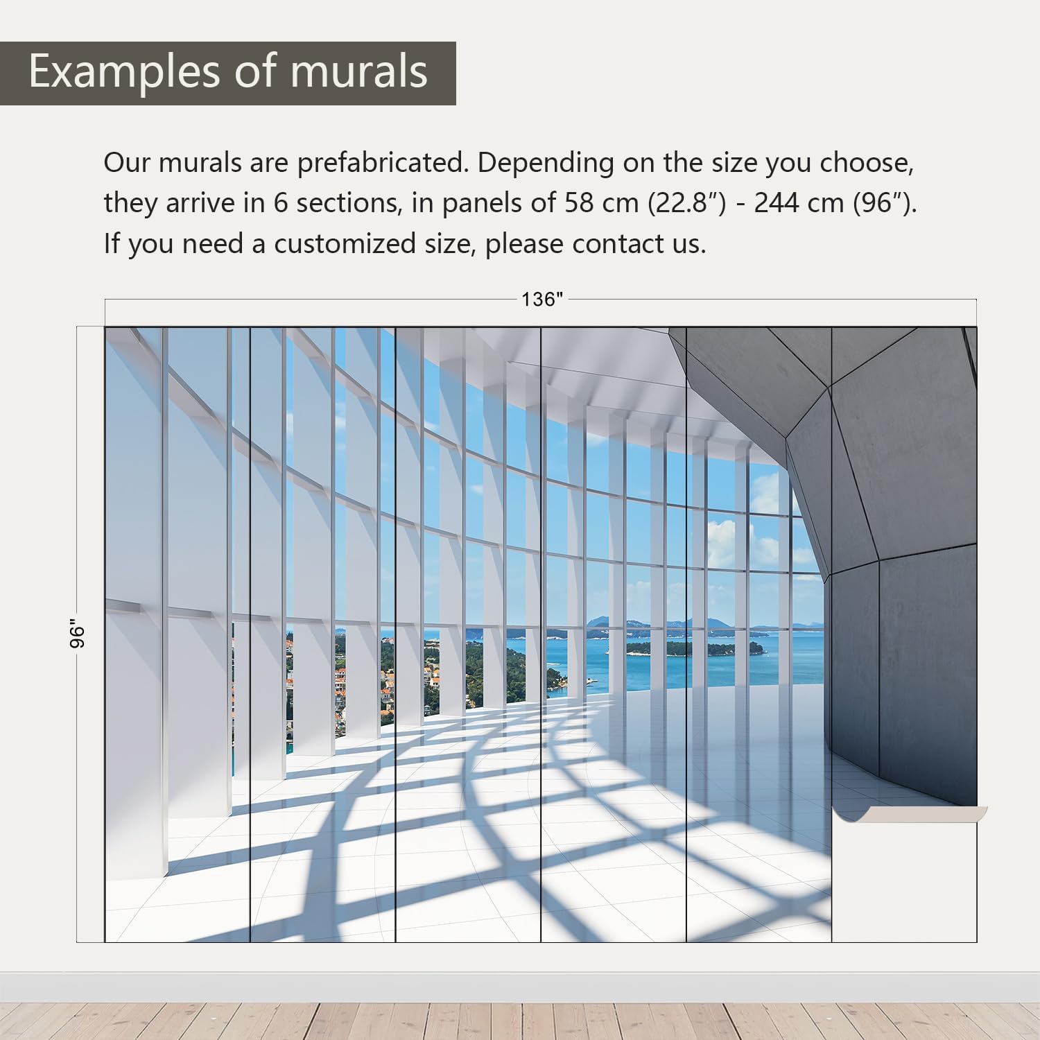 - Size note: Mural measures 136"W x 96"H and is divided into 6 sections, each section is labeled with a number underneath, eliminating the need to overlap patterns when installing.