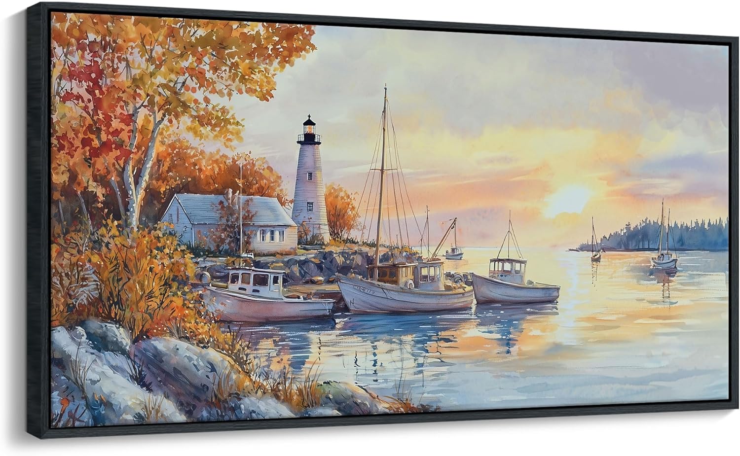 QZQCBLC Sunset Landscape Wall Art, Sea Harbor Lighthouse Ink Paintings Framed Artwork Homeward-bound Boat Soft Tone Wall Pictures for Living room Bedroom Bathroom Home Office Decor 20x40 IN