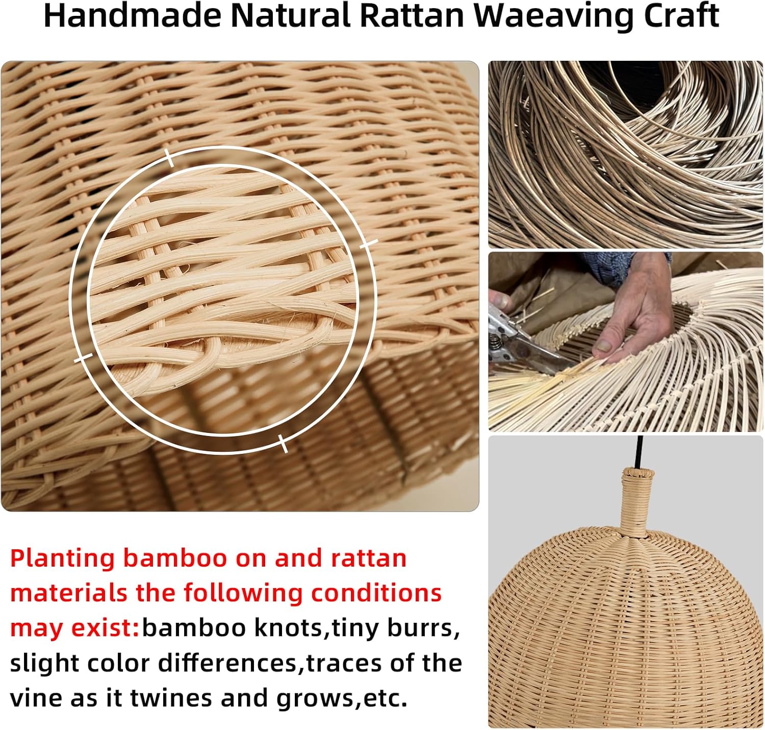 - 2. Handmade Products Bamboo woven lamps are purely handmade, and there will be traces of handcrafting on the lamps in detail. Each product will have some differences, such as the following For example, if the interface of the bamboo lampshade ring is slightly larger or the gap is slightly different, it is not a quality problem. If you cannot accept the characteristics of natural materials and handmade products, please purchase with caution, we apologize for the inconvenience