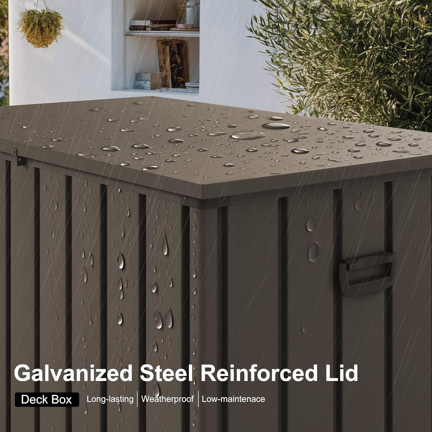 - Galvanized Steel Reinforced Lid:This sturdy storage box features a galvanized steel-reinforced lid that is fade-resistant, weatherproof, and rustproof for at least 2 years.