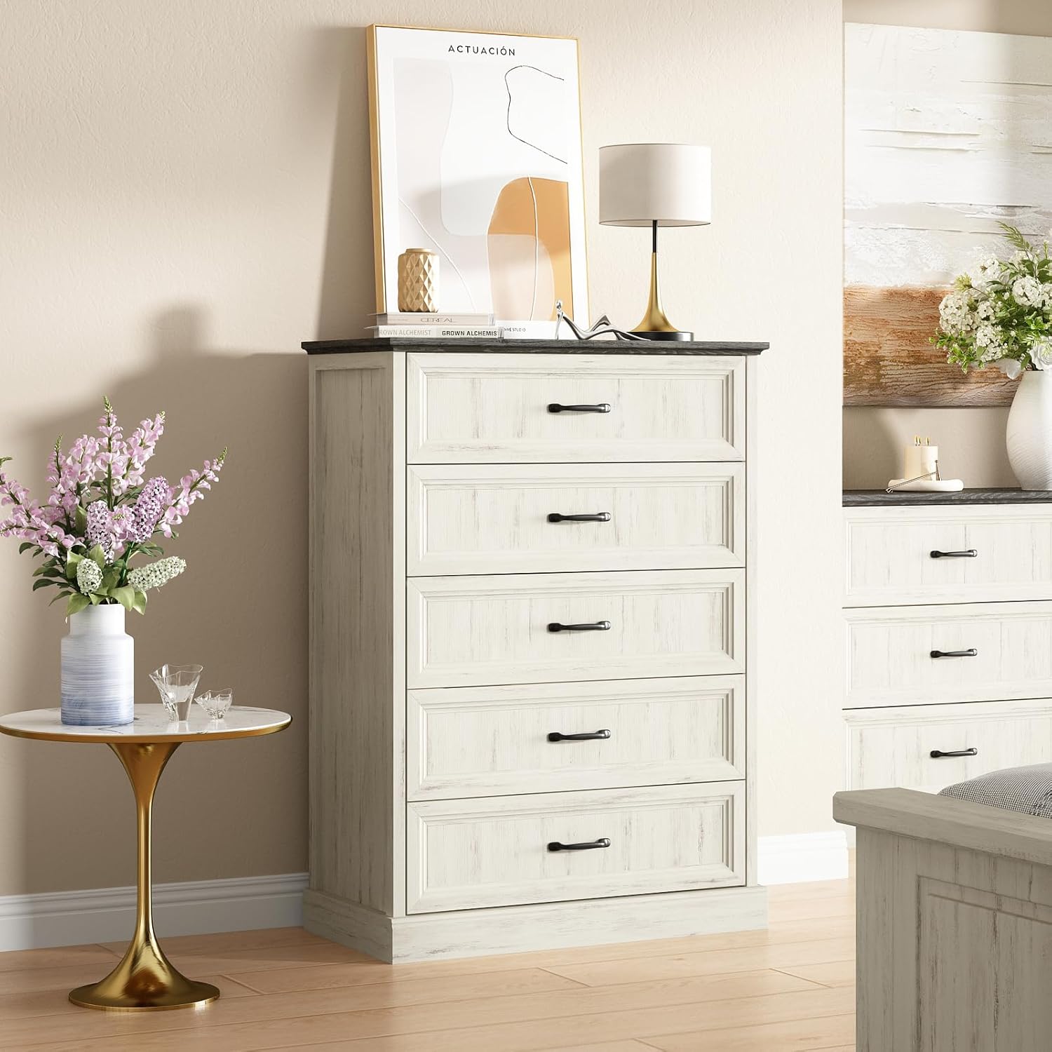 - Versatile, Stylish Dresser: Measuring 31.5"W × 15.7"D × 44.1"H, this versatile tall farmhouse dresser for bedoom offers an array of possibilities for your home organization. It features 5 smooth-glide drawers, each measuring 27.9"W × 11.3"D × 5.7"H, offering efficient storage solutions. Keep your space clean and organized by conveniently stowing clothing, socks, bedding, cosmetics, jewelry, and more. The natural-textured tabletop gives you more space to display your cherished photos, artworks, and decorations, turning your room into a captivating gallery.