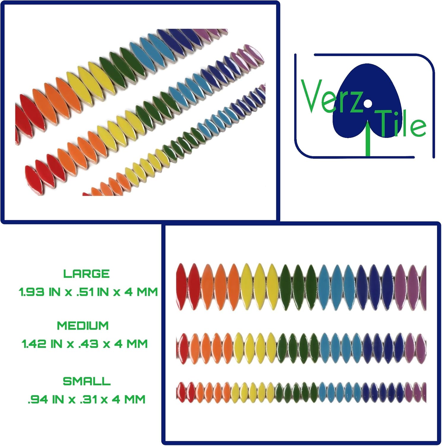 - High Fired Equals Durability; Ceramic Mosaic Tiles are Water Resistant with a Shiney Glazed Finish; Mosaic Pieces in 3 Sizes; Small Tiles(.94in x .31in or 2.4cm x 0.8cm) Medium (1.42in x .43in or 3.6cm x 1.1cm) Large (1.93in x .51in or 4.9cm x 1.3cm); Thickness 4mm