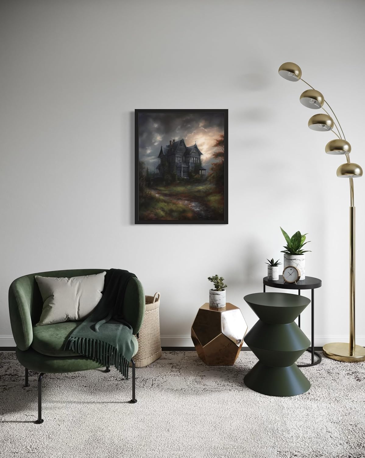 Haunted House Poster Art Print, Halloween Scary Vintage Wall Art Academia Spooky Painting Decoration for Horror Prints, Gothic Posters Bedroom Decor 89 (Haunted House, 11 x 14 inches, Black Frame)