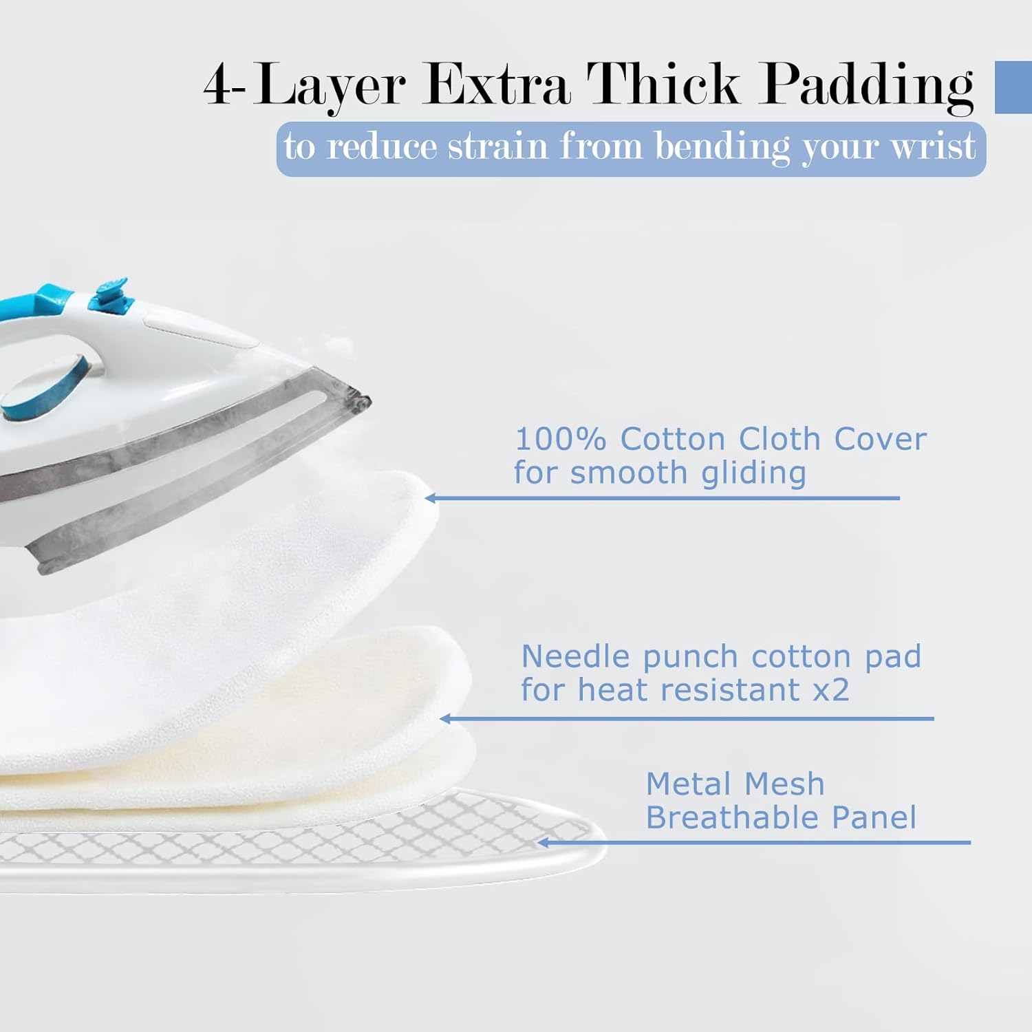 - 3-Layer Cover: ASHARE iron table's cover is made of 2 layer needle-punch cotton and l layer pure cotton, providing a good cushion for ironing while permitting the absorption of excess steam β resulting in a faster ironing process