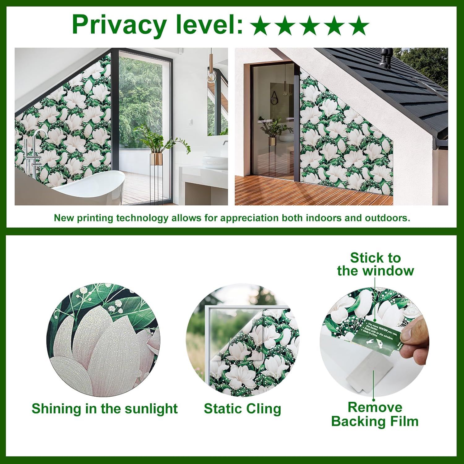 Window Privacy Film Stained Glass Decorative Static Clings Frosted Window Tint for Home Room Decor Bathroom Door Car Stickers with Glittering Effect, Removable(Magnolia Design)
