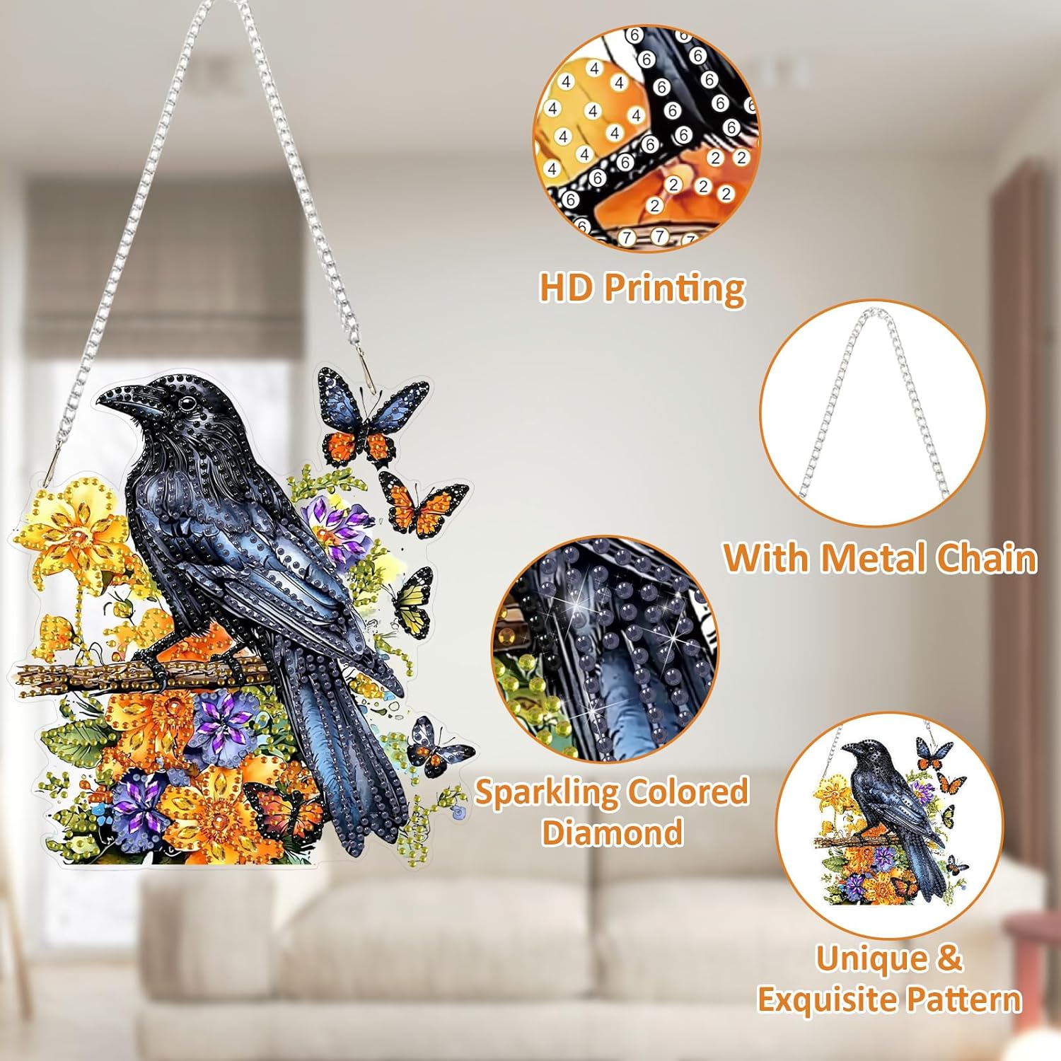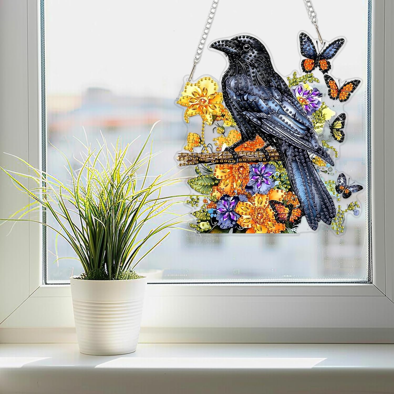 SENQAO Crow Diamond Art Hanging Kit for Adult, Special Shaped Rhinestone, Double Sided DIY Acrylic Diamond Art Painting Window Pendants Home Garden Wall Hanging Kits Hanging Ornament