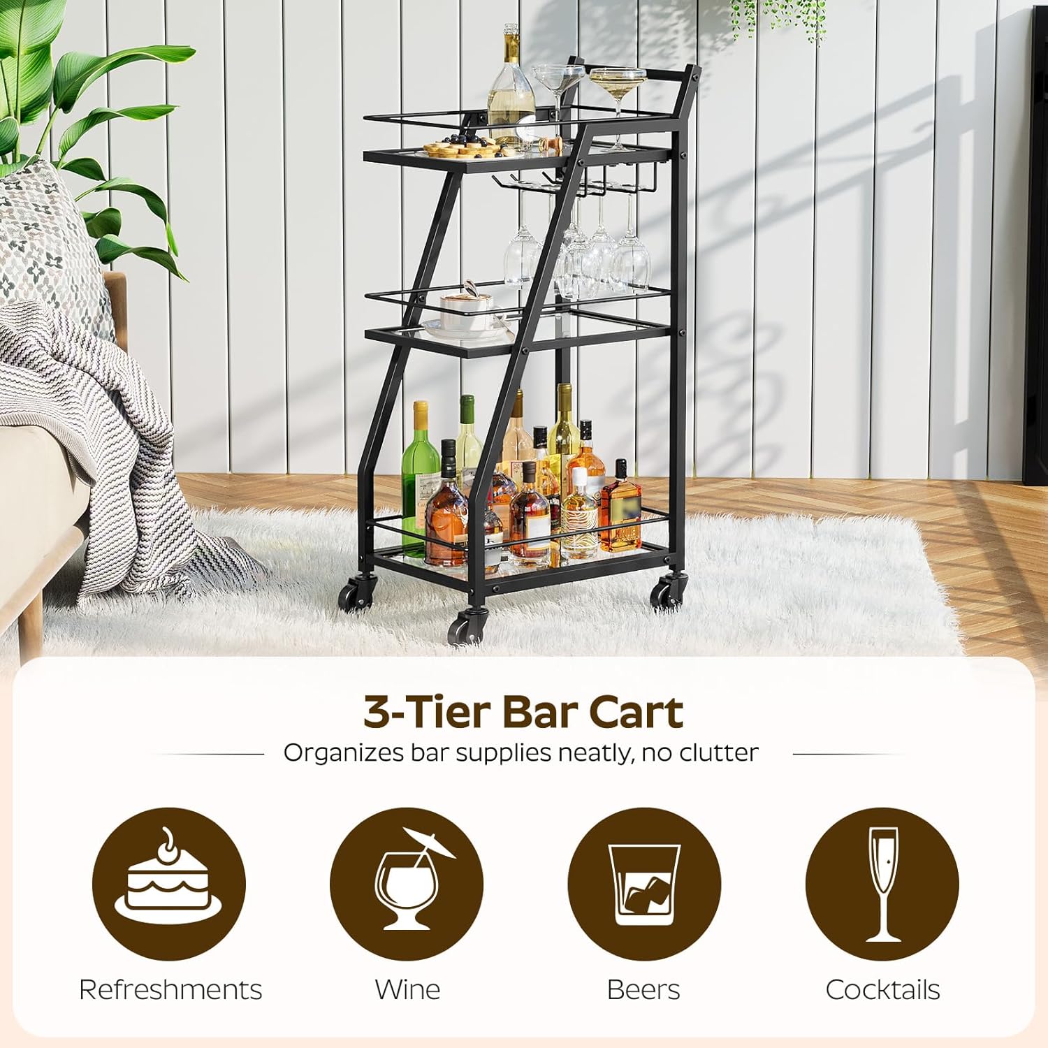 Bar Cart, 3-Tier Bar Cart for The Home, Home Bar Serving Cart with Glass Holders, Beverage Cart for Kitchen, Dining, Party Room, Black BC03BK