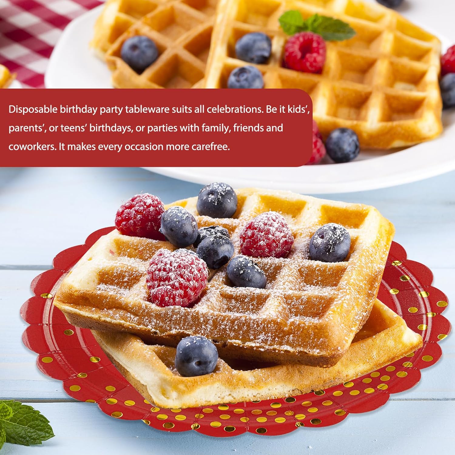 50PCS Red Paper Plates, 7 Inch Scalloped Red and Gold Party Plates Disposable Foil Polka Dots Dessert Plate Cake Plate for Wedding Baby Shower Birthday Anniversary Bachelorette Dinner BBQ